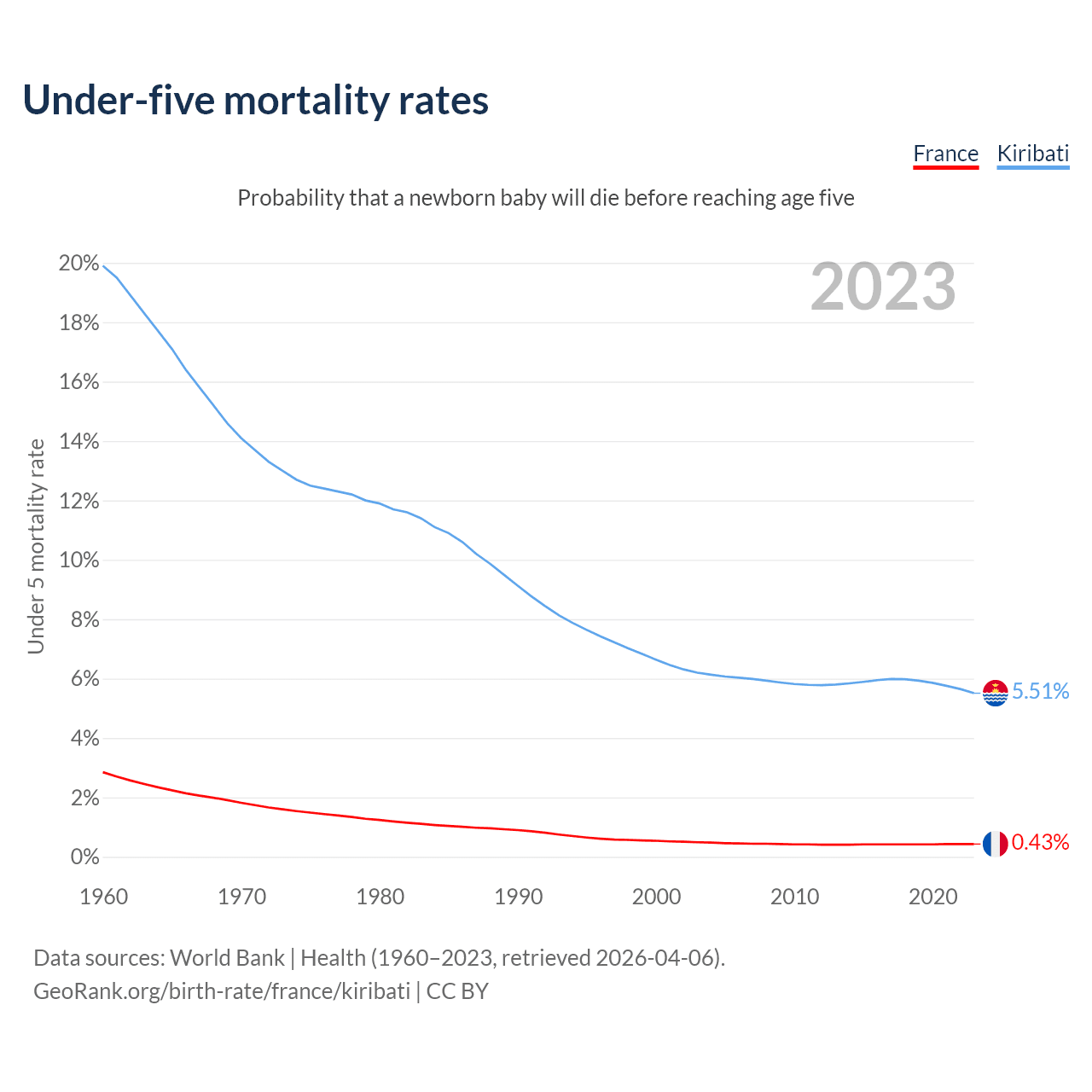 The chance that a newborn baby will die before reaching age five is 0.43% in France and 5.51% in Kiribati. Above is a chart with historical data on under-five mortality rates.