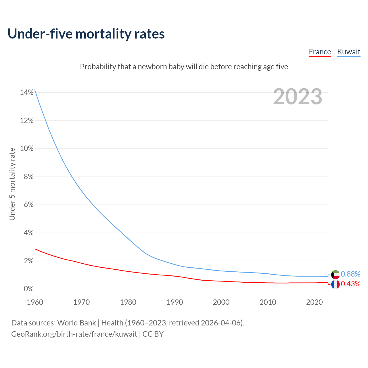 The chance that a newborn baby will die before reaching age five is 0.43% in France and 0.88% in Kuwait. Above is a chart with historical data on under-five mortality rates.