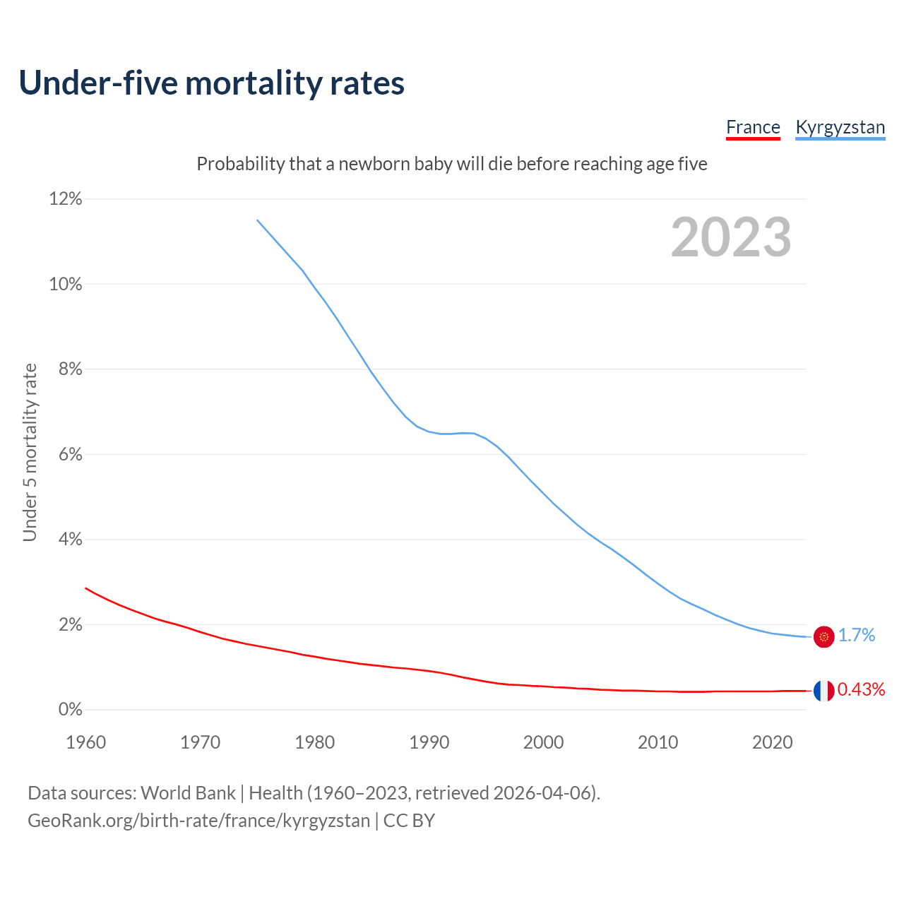 The chance that a newborn baby will die before reaching age five is 0.43% in France and 1.7% in Kyrgyzstan. Above is a chart with historical data on under-five mortality rates.