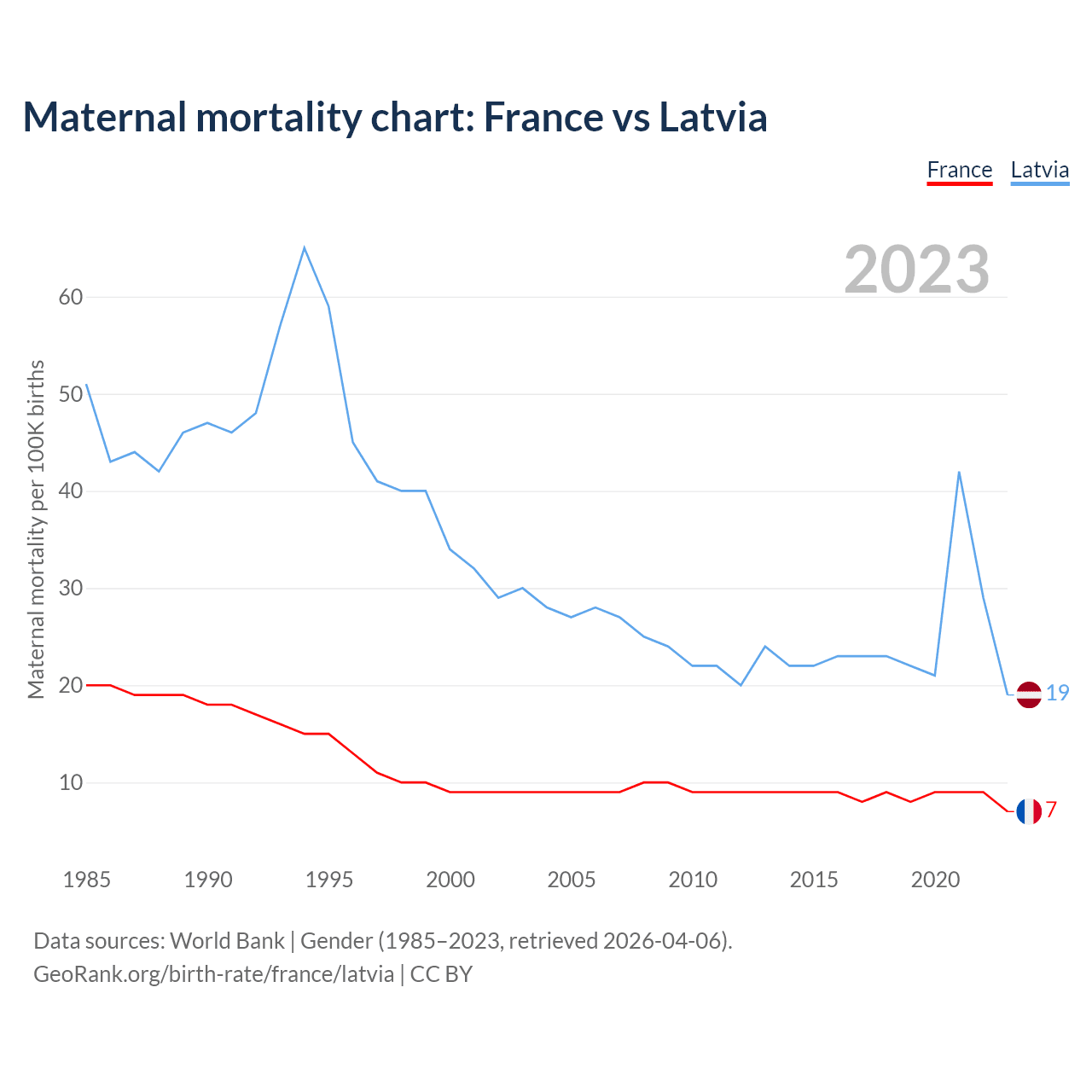 The maternal mortality rate, which is the probability of dying during childbirth or within 42 days of pregnancy termination, is 7 deaths per 100,000 live births in France, compared to 19 deaths in Latvia.