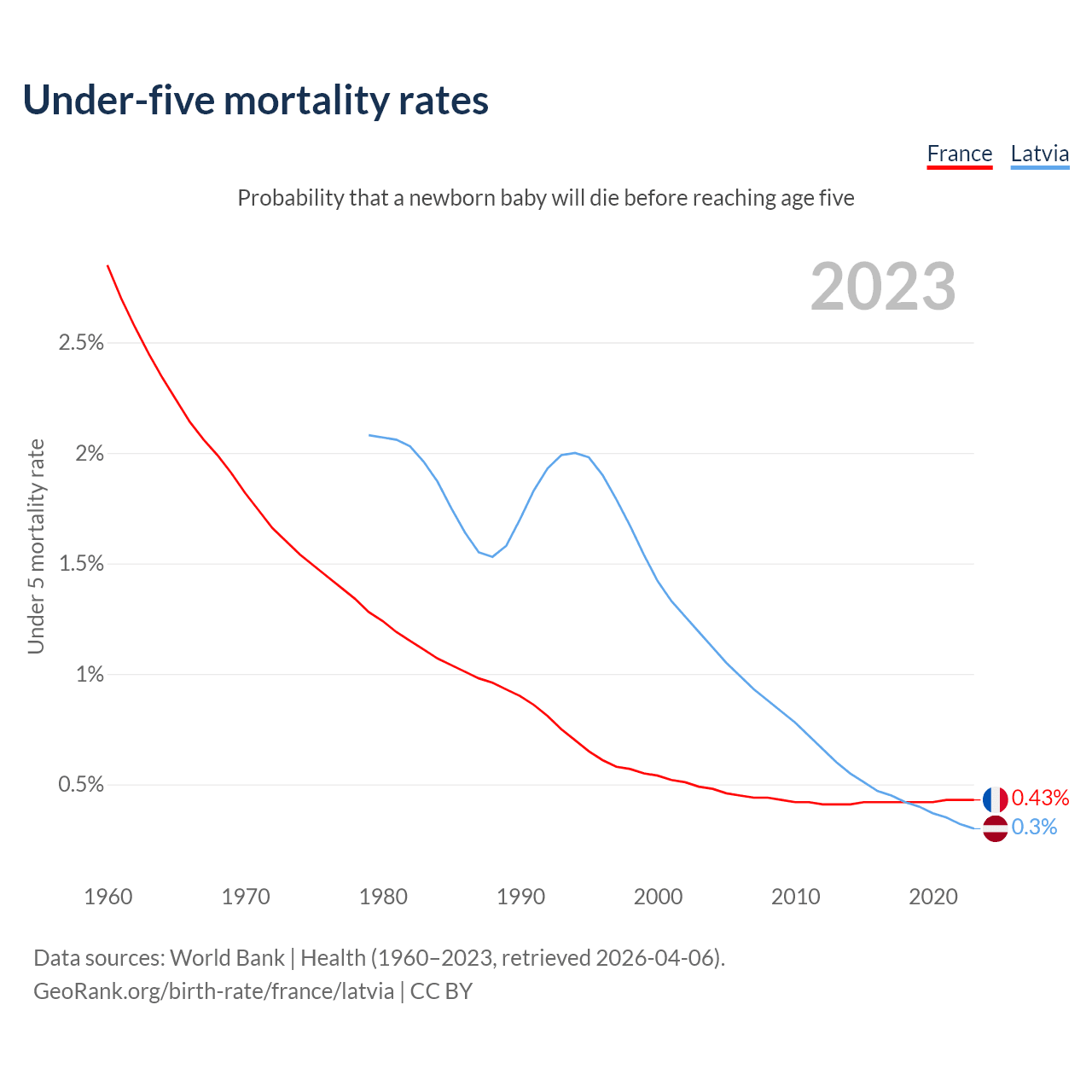 The chance that a newborn baby will die before reaching age five is 0.43% in France and 0.3% in Latvia. Above is a chart with historical data on under-five mortality rates.