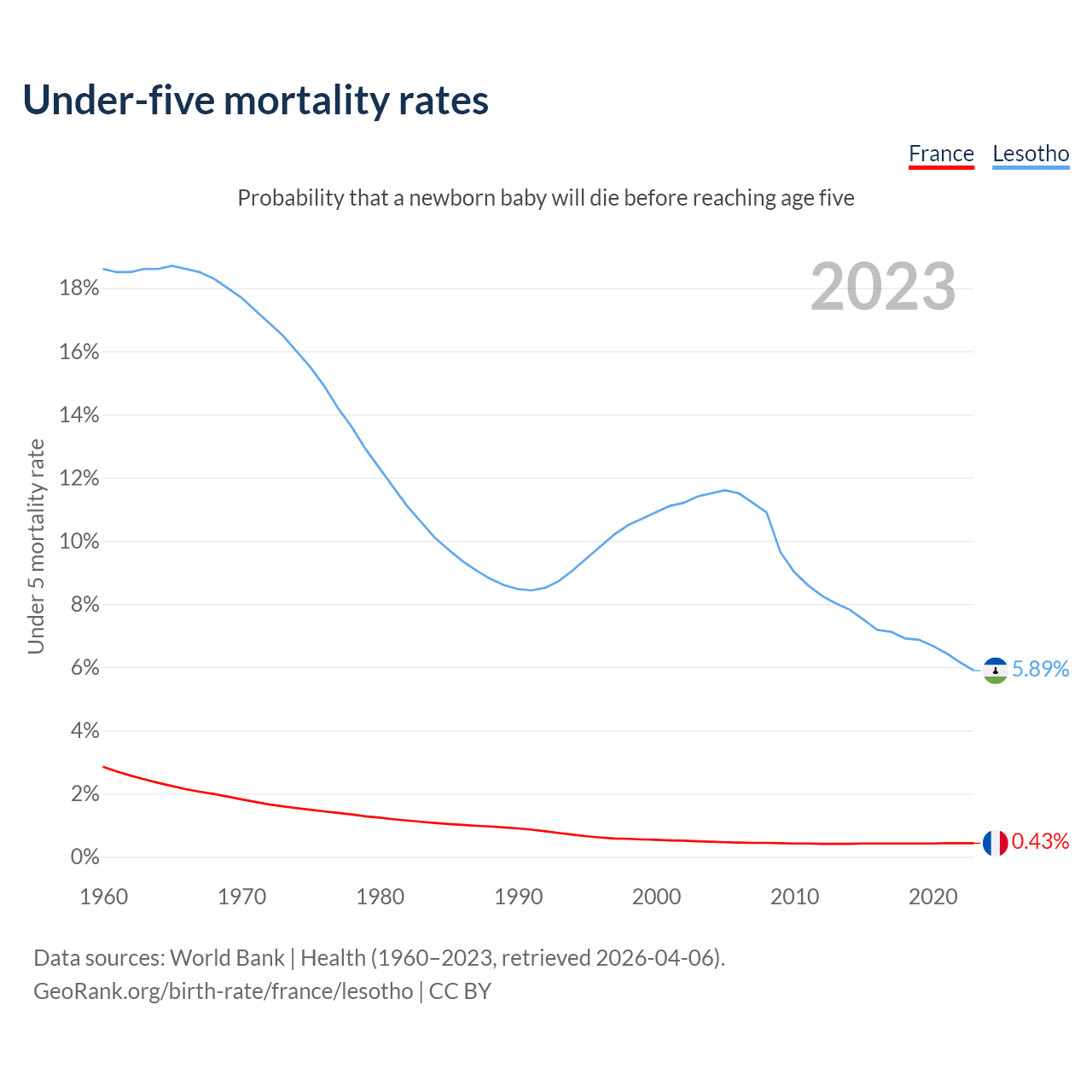 The chance that a newborn baby will die before reaching age five is 0.43% in France and 5.89% in Lesotho. Above is a chart with historical data on under-five mortality rates.