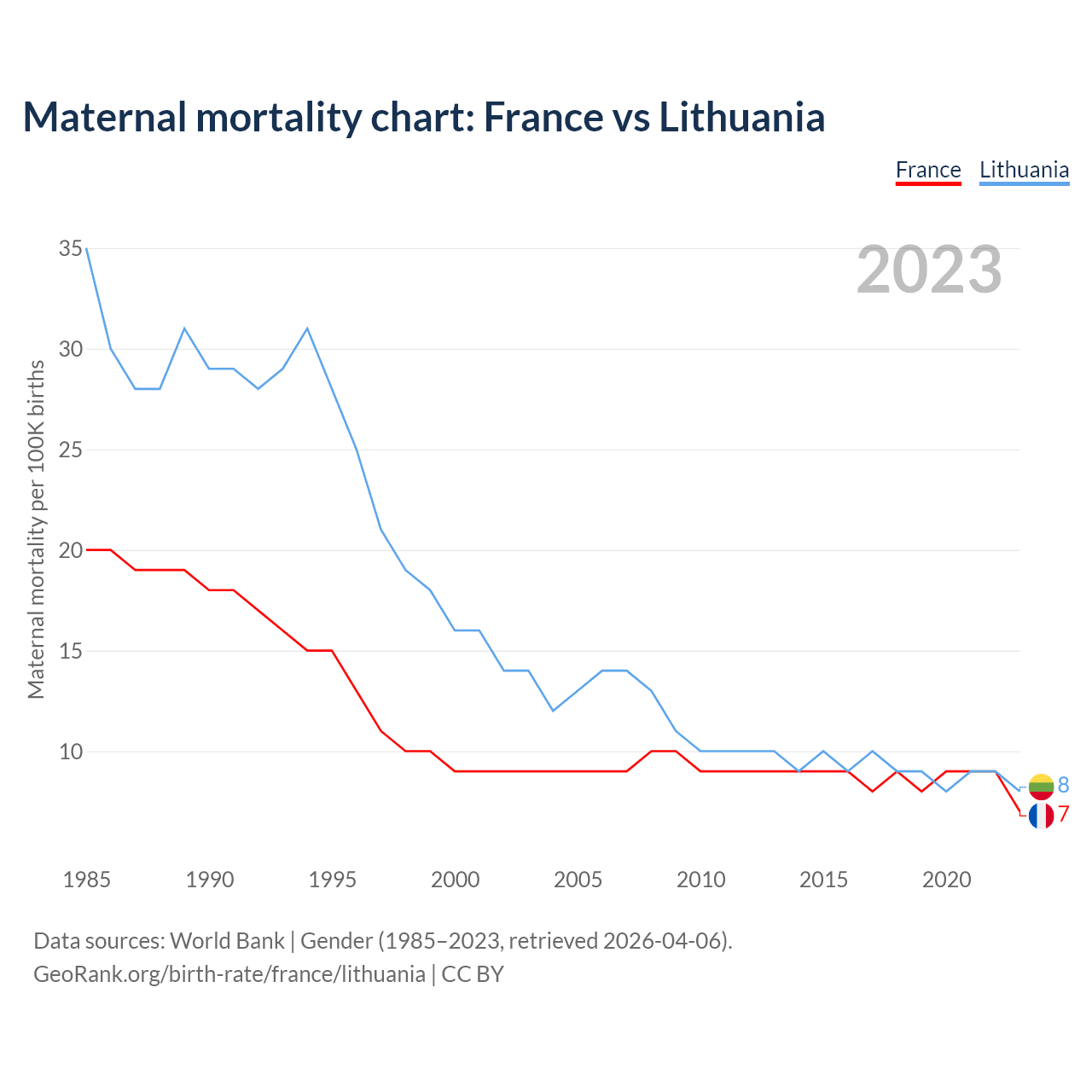 The maternal mortality rate, which is the probability of dying during childbirth or within 42 days of pregnancy termination, is 7 deaths per 100,000 live births in France, compared to 8 deaths in Lithuania.