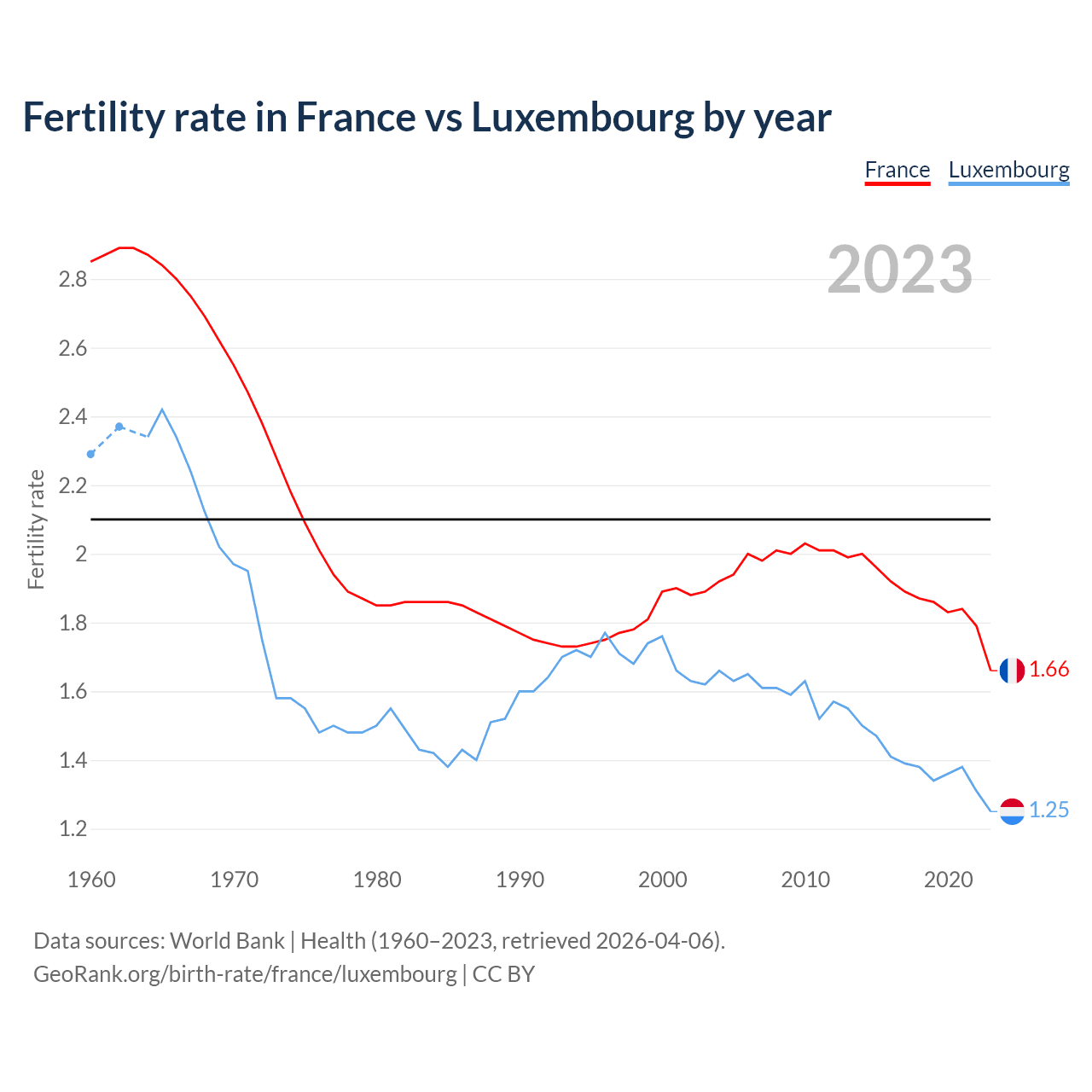 According to the latest available data on birth rates, the fertility rate in France was 1.66 children per woman in 2023, compared to 1.25 in Luxembourg in 2023. The replacement level is considered to be 2.1 children per woman.