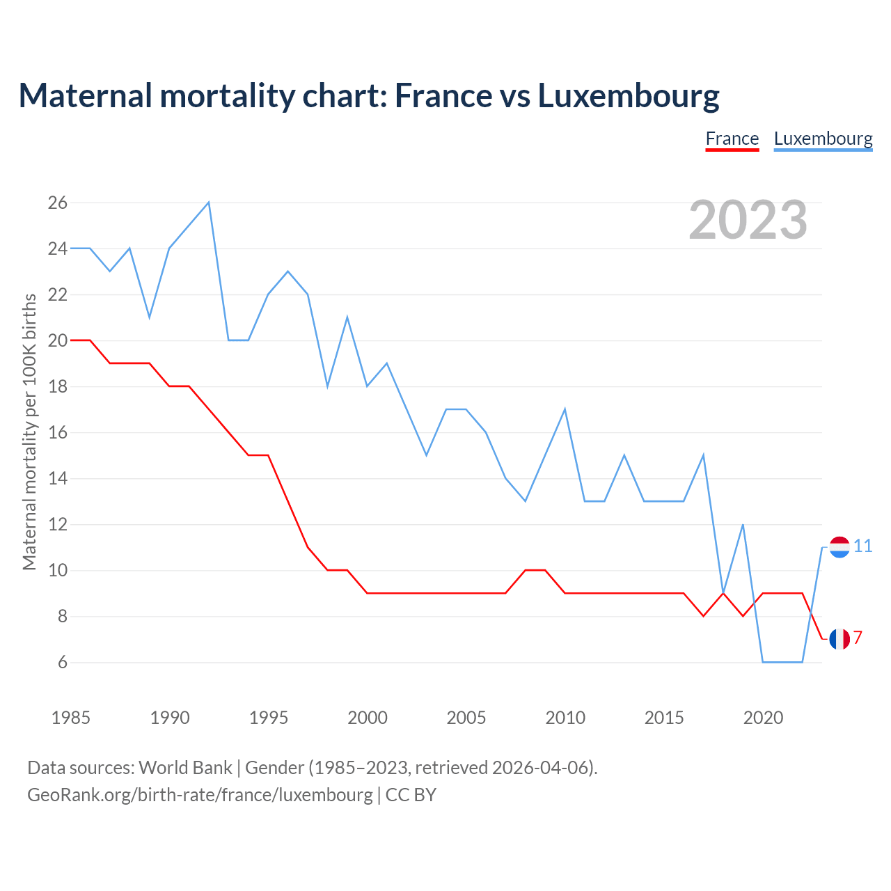 The maternal mortality rate, which is the probability of dying during childbirth or within 42 days of pregnancy termination, is 7 deaths per 100,000 live births in France, compared to 11 deaths in Luxembourg.