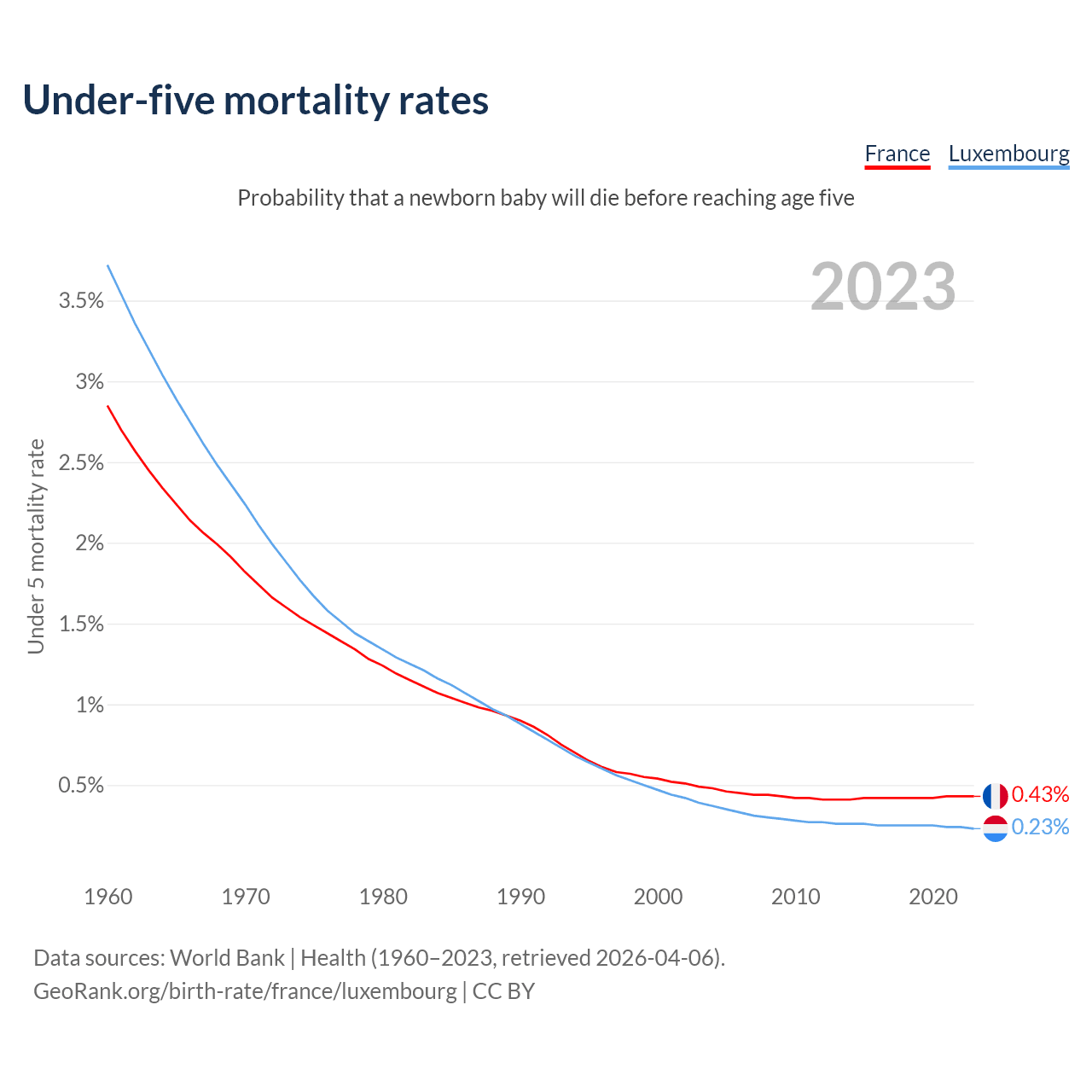The chance that a newborn baby will die before reaching age five is 0.43% in France and 0.23% in Luxembourg. Above is a chart with historical data on under-five mortality rates.