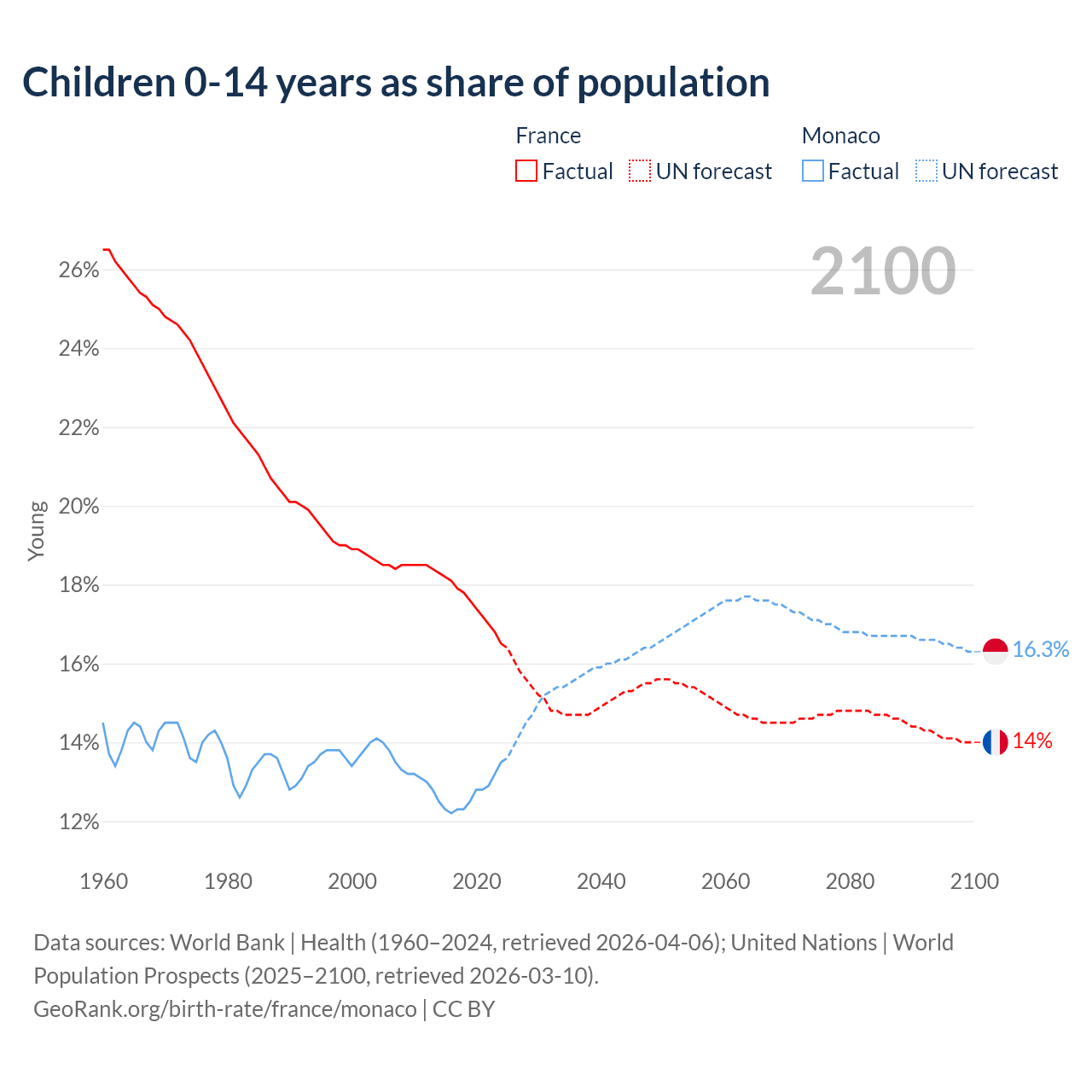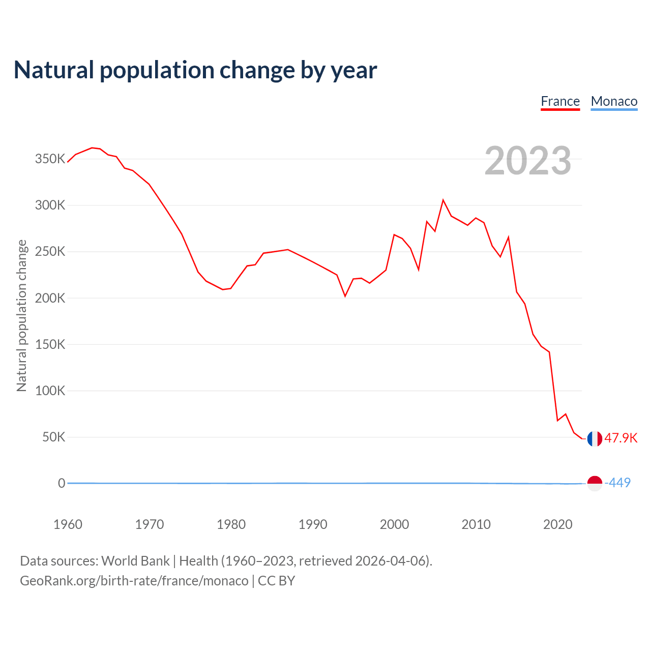 According to the latest available data on birth rates, the fertility rate in France was 1.66 children per woman in 2023, compared to 2.11 in Monaco in 2023. The replacement level is considered to be 2.1 children per woman.