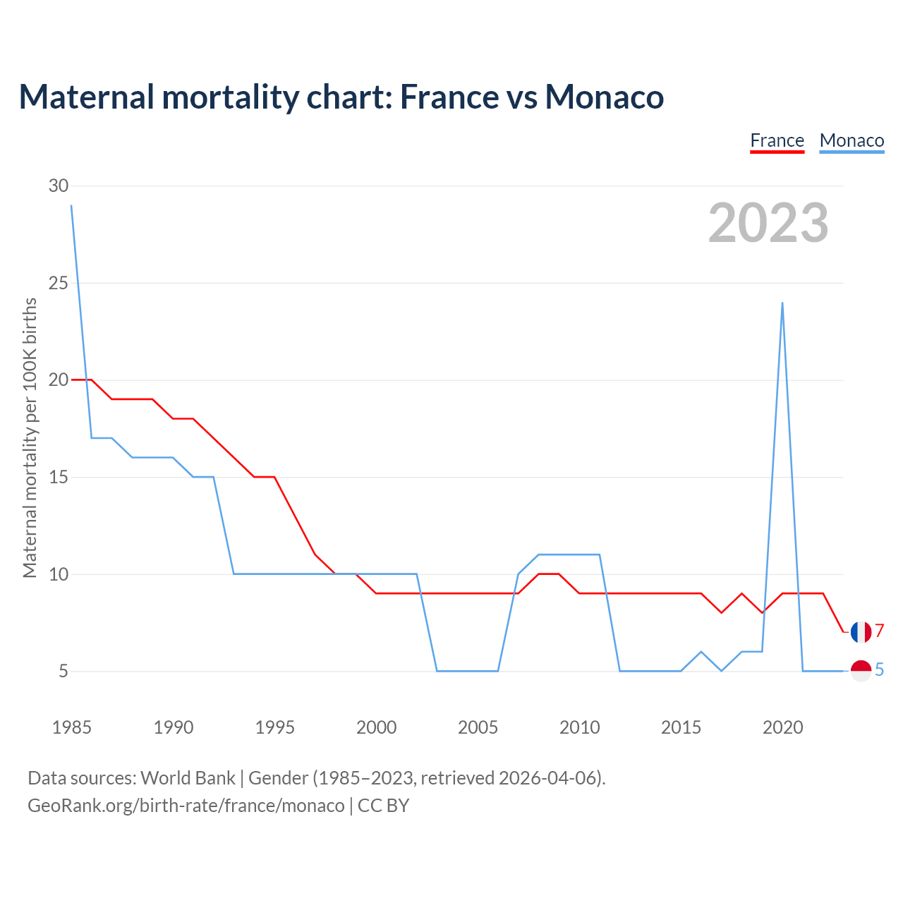 The maternal mortality rate, which is the probability of dying during childbirth or within 42 days of pregnancy termination, is 7 deaths per 100,000 live births in France, compared to 5 deaths in Monaco.