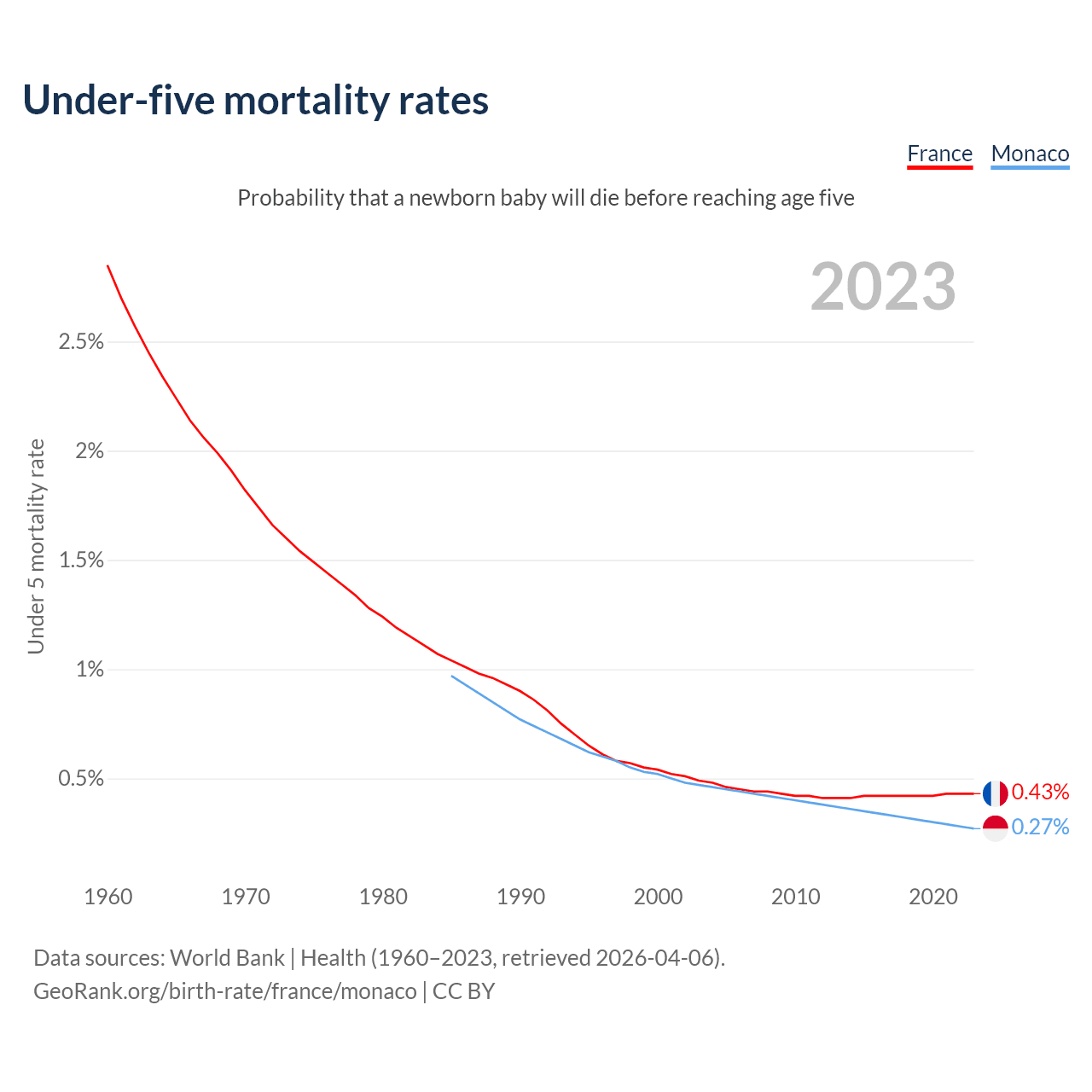 The chance that a newborn baby will die before reaching age five is 0.43% in France and 0.27% in Monaco. Above is a chart with historical data on under-five mortality rates.