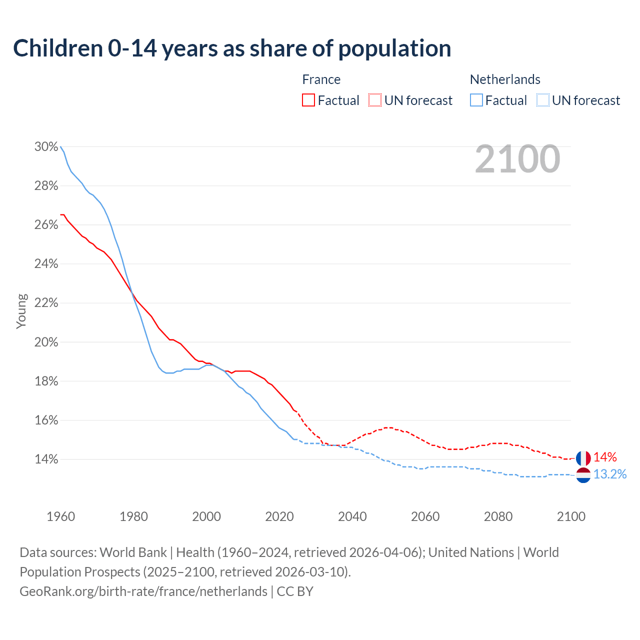 France has an annual birth rate of 9.9 births per 1,000 people, compared to 9.2 for the Netherlands. The average number of children a woman is expected to have during her lifetime — the fertility rate, is 1.66 in France and 1.43 in the Netherlands — 13.9% difference.