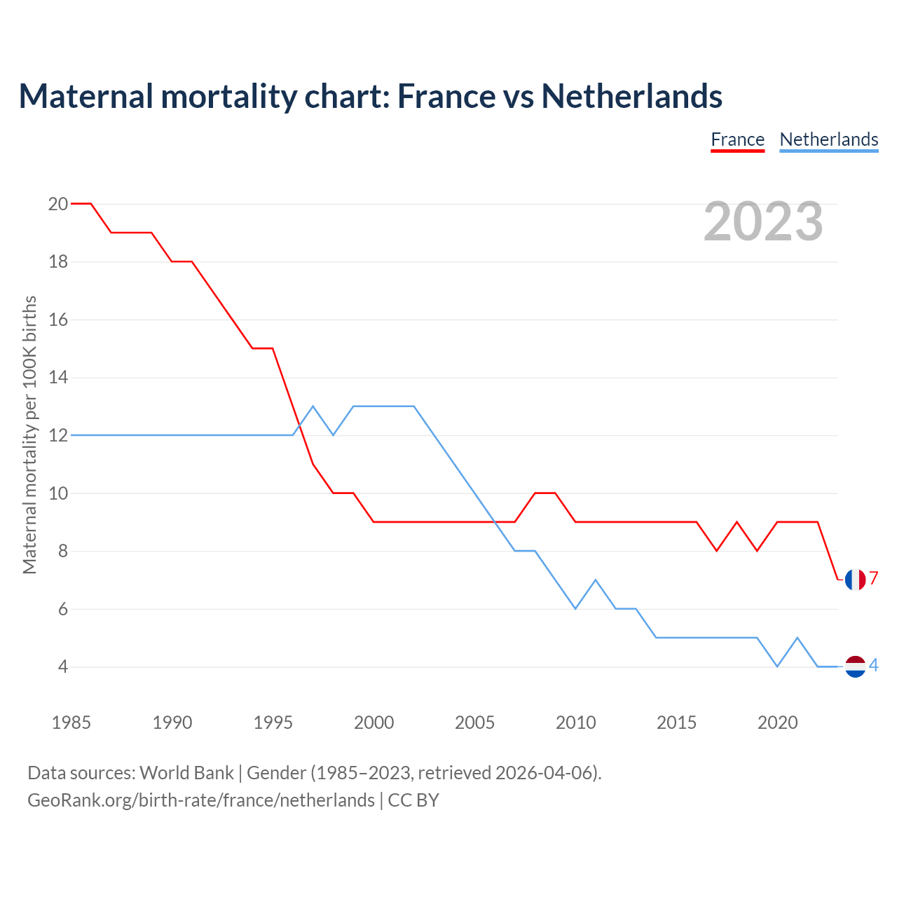 The maternal mortality rate, which is the probability of dying during childbirth or within 42 days of pregnancy termination, is 7 deaths per 100,000 live births in France, compared to 4 deaths in the Netherlands.