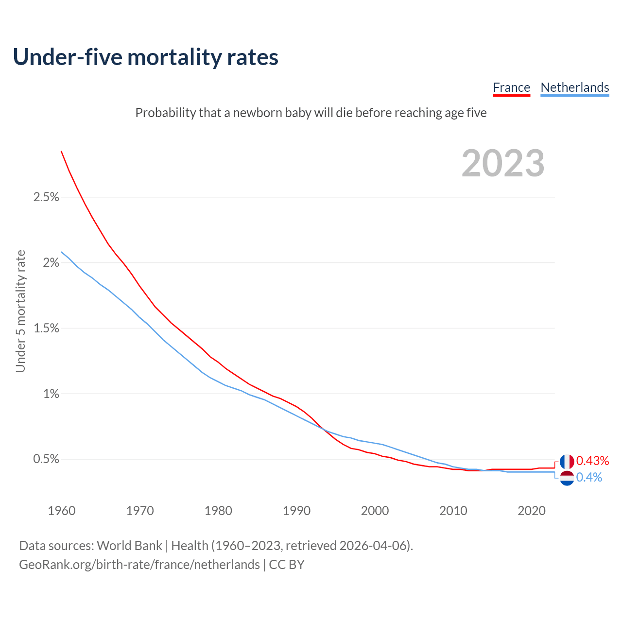The chance that a newborn baby will die before reaching age five is 0.43% in France and 0.4% in the Netherlands. Above is a chart with historical data on under-five mortality rates.