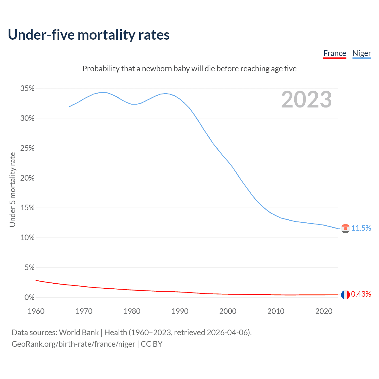 The chance that a newborn baby will die before reaching age five is 0.43% in France and 11.5% in Niger. Above is a chart with historical data on under-five mortality rates.