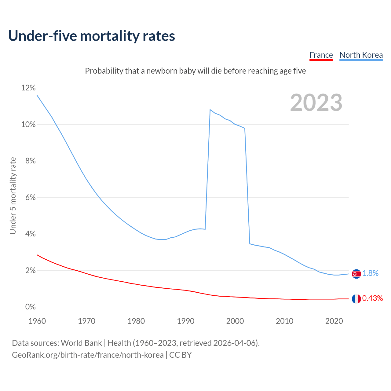 The chance that a newborn baby will die before reaching age five is 0.43% in France and 1.8% in North Korea. Above is a chart with historical data on under-five mortality rates.