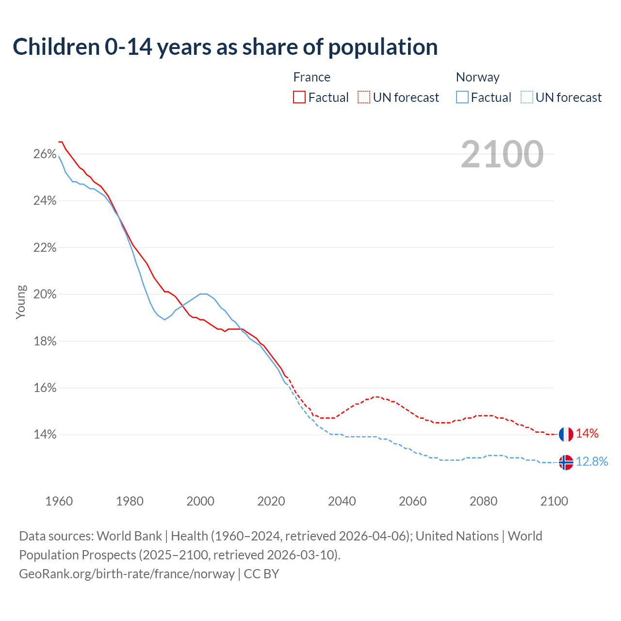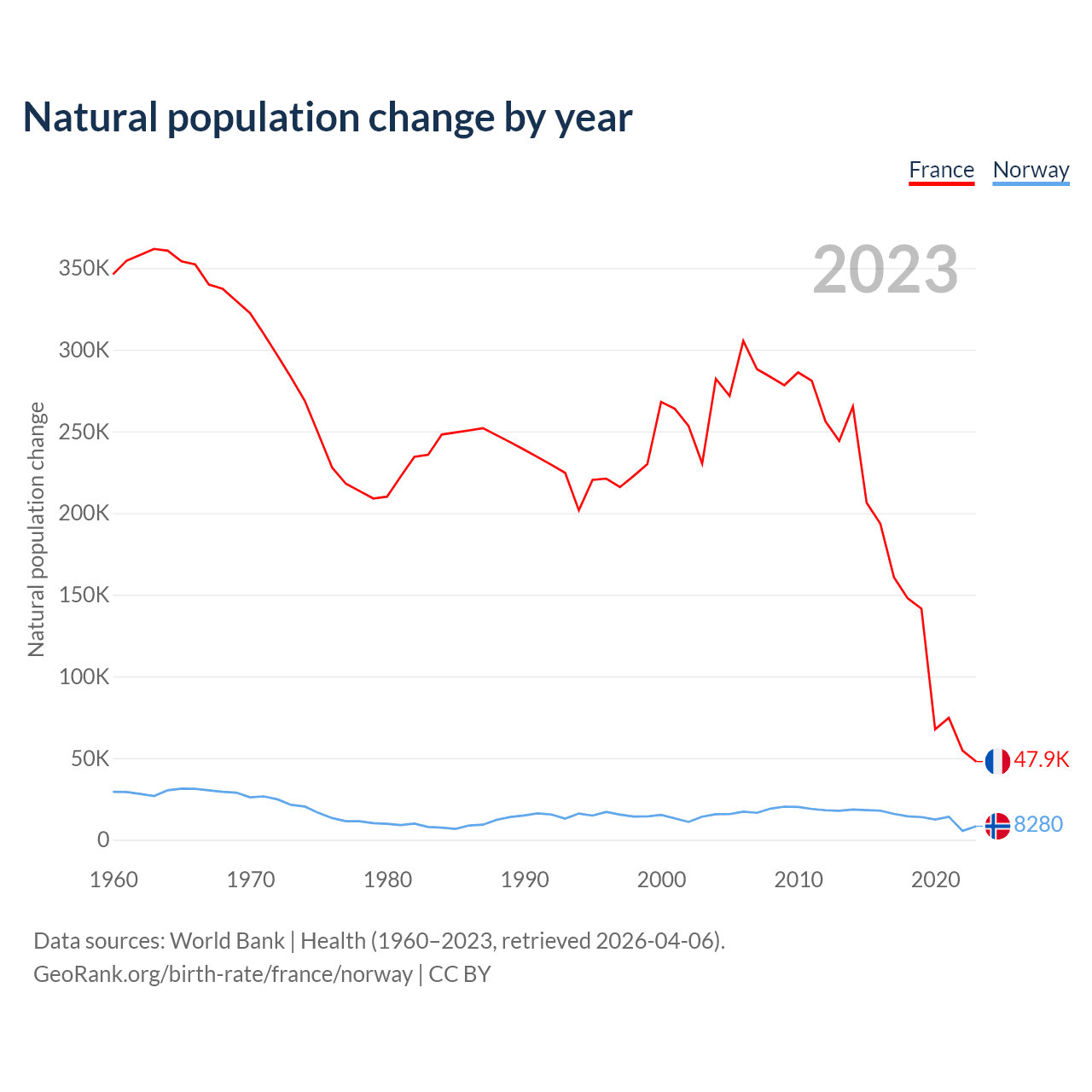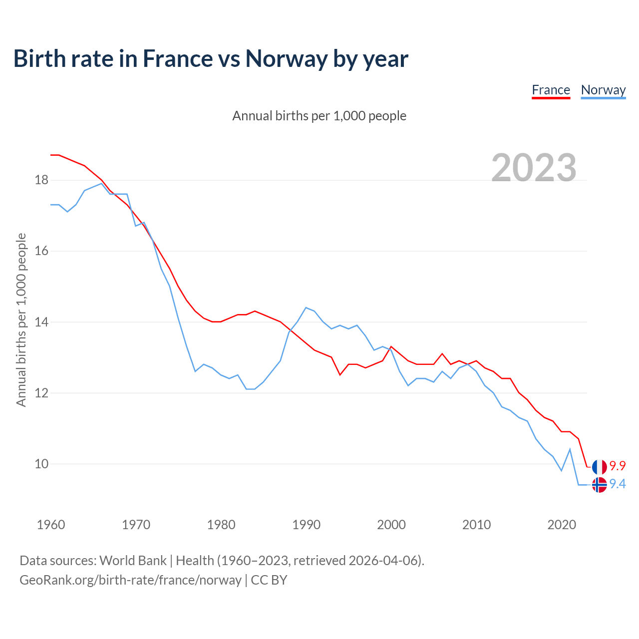 According to the latest available data on birth rates, the fertility rate in France was 1.66 children per woman in 2023, compared to 1.4 in Norway in 2023. The replacement level is considered to be 2.1 children per woman.