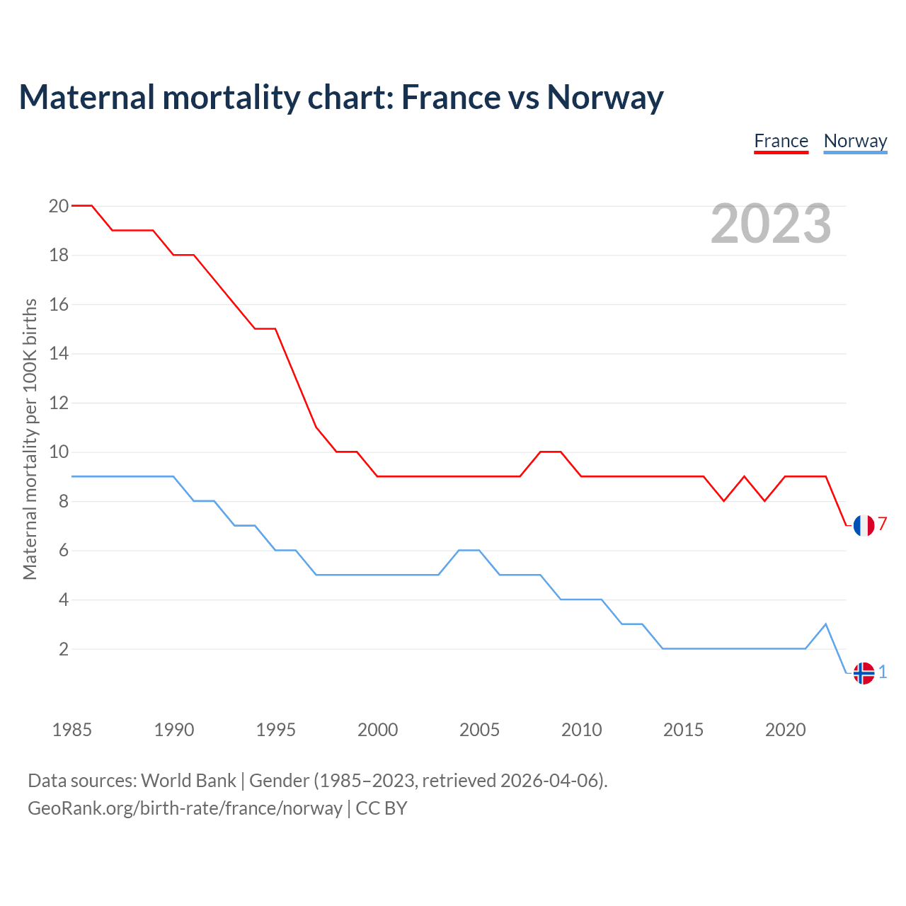 The maternal mortality rate, which is the probability of dying during childbirth or within 42 days of pregnancy termination, is 7 deaths per 100,000 live births in France, compared to 1 deaths in Norway.