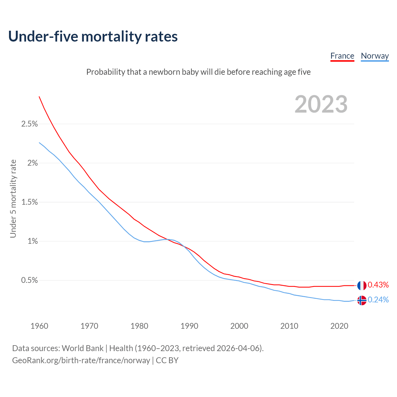 The chance that a newborn baby will die before reaching age five is 0.43% in France and 0.24% in Norway. Above is a chart with historical data on under-five mortality rates.