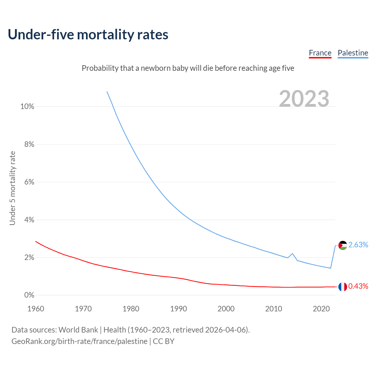 The chance that a newborn baby will die before reaching age five is 0.43% in France and 2.63% in Palestine. Above is a chart with historical data on under-five mortality rates.