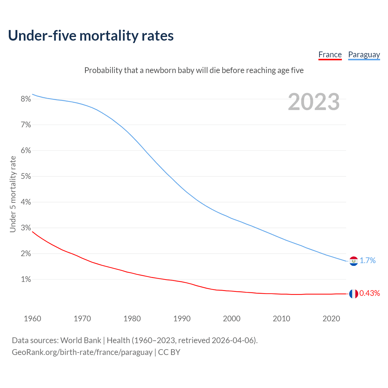 The chance that a newborn baby will die before reaching age five is 0.43% in France and 1.7% in Paraguay. Above is a chart with historical data on under-five mortality rates.