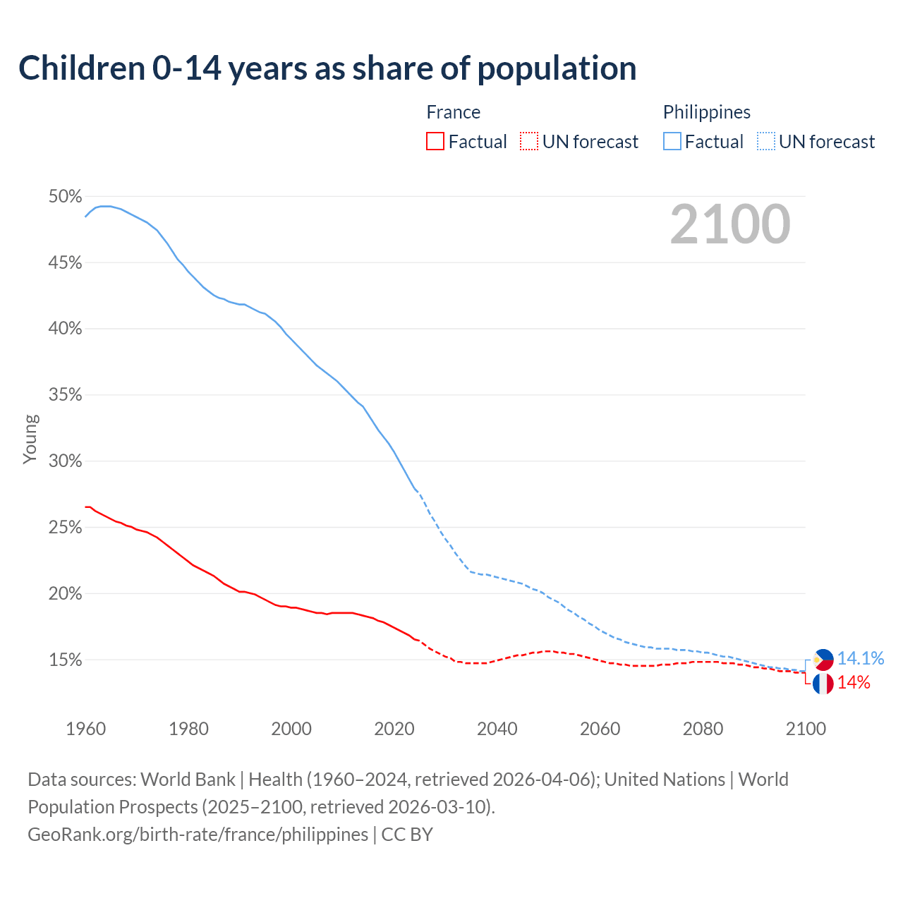 According to the latest available data on birth rates, the fertility rate in France was 1.66 children per woman in 2023, compared to 1.92 in the Philippines in 2023. The replacement level is considered to be 2.1 children per woman.
