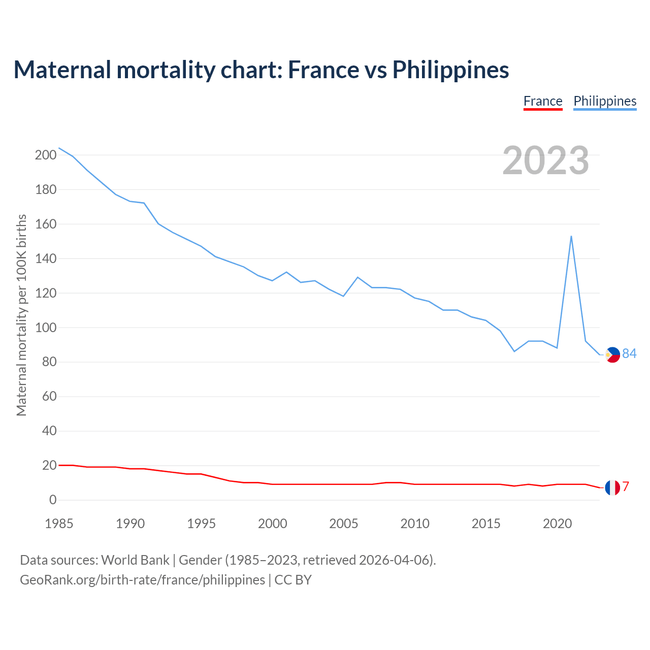 The maternal mortality rate, which is the probability of dying during childbirth or within 42 days of pregnancy termination, is 7 deaths per 100,000 live births in France, compared to 84 deaths in the Philippines.