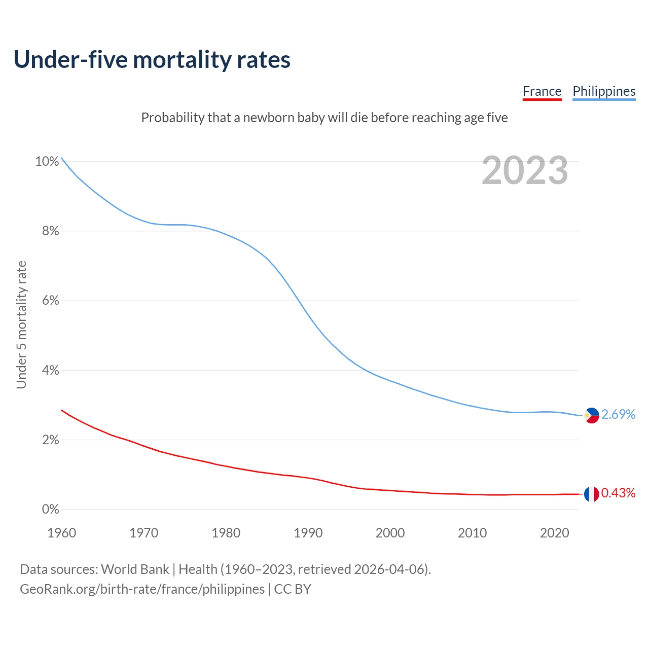 The chance that a newborn baby will die before reaching age five is 0.43% in France and 2.69% in the Philippines. Above is a chart with historical data on under-five mortality rates.