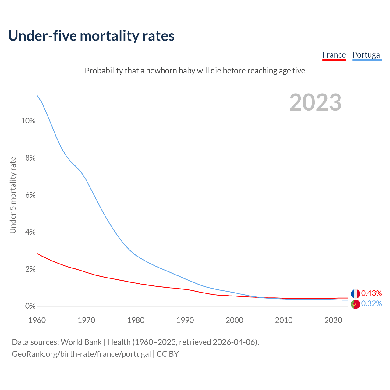 The chance that a newborn baby will die before reaching age five is 0.43% in France and 0.32% in Portugal. Above is a chart with historical data on under-five mortality rates.