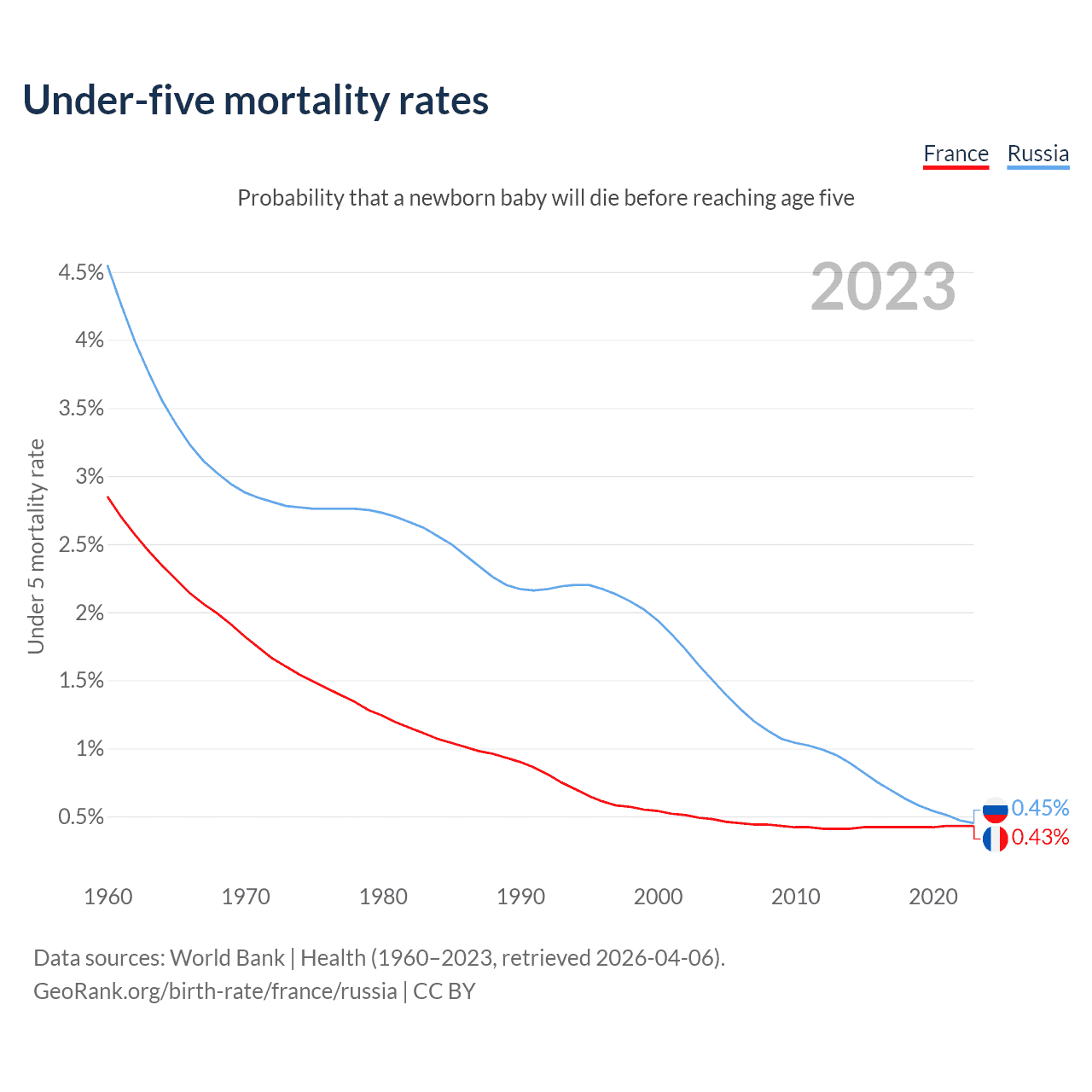The chance that a newborn baby will die before reaching age five is 0.43% in France and 0.45% in Russia. Above is a chart with historical data on under-five mortality rates.