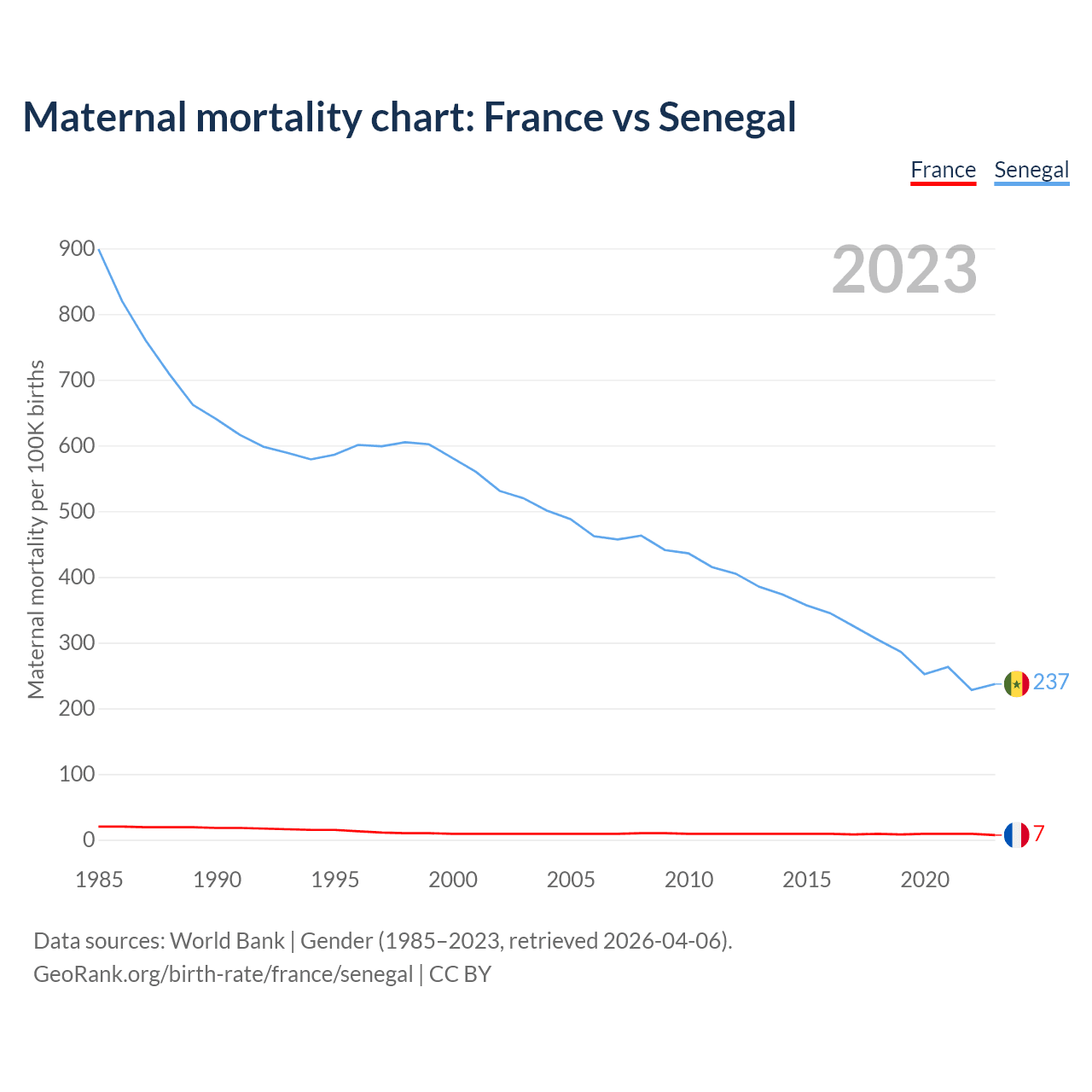 The maternal mortality rate, which is the probability of dying during childbirth or within 42 days of pregnancy termination, is 7 deaths per 100,000 live births in France, compared to 237 deaths in Senegal.