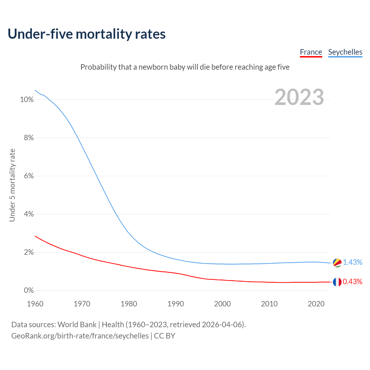 The chance that a newborn baby will die before reaching age five is 0.43% in France and 1.43% in the Seychelles. Above is a chart with historical data on under-five mortality rates.
