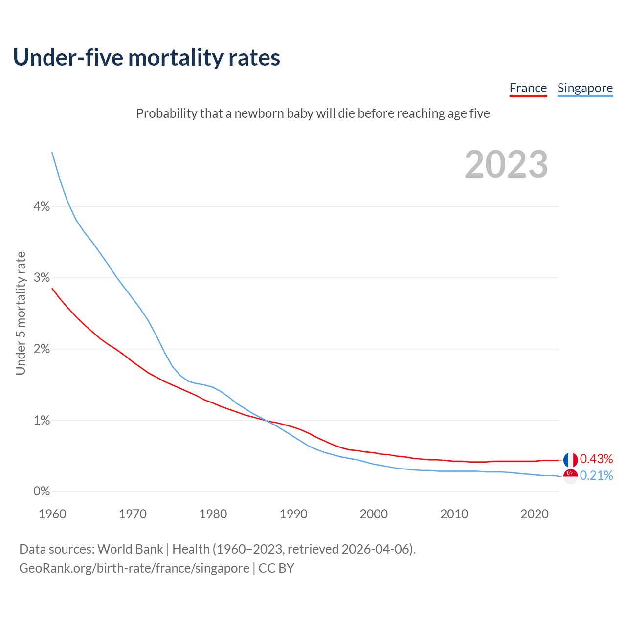 The chance that a newborn baby will die before reaching age five is 0.43% in France and 0.21% in Singapore. Above is a chart with historical data on under-five mortality rates.