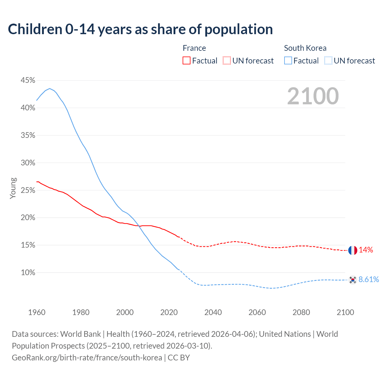 According to the latest available data on birth rates, the fertility rate in France was 1.66 children per woman in 2023, compared to 0.72 in South Korea in 2023. The replacement level is considered to be 2.1 children per woman.