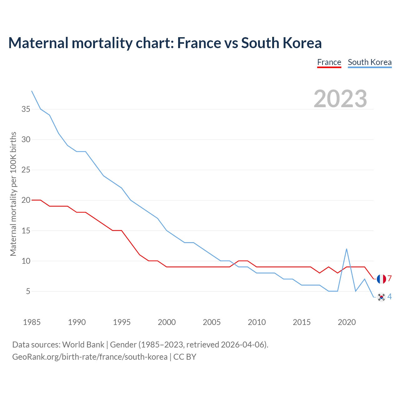 The maternal mortality rate, which is the probability of dying during childbirth or within 42 days of pregnancy termination, is 7 deaths per 100,000 live births in France, compared to 4 deaths in South Korea.