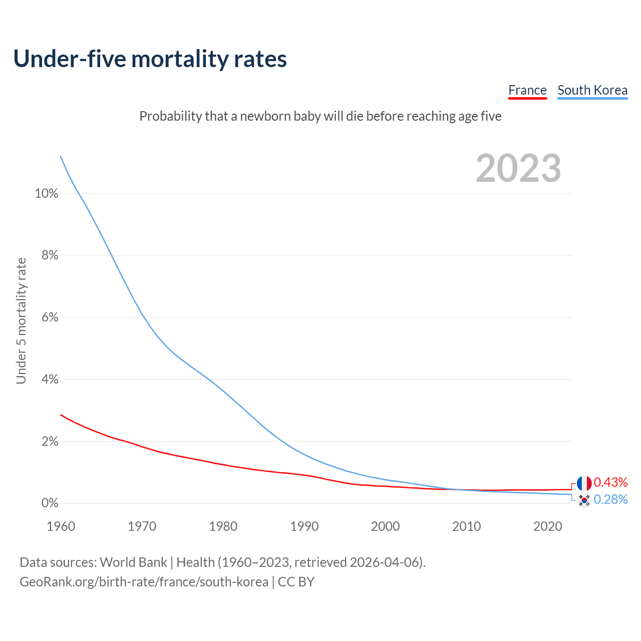 The chance that a newborn baby will die before reaching age five is 0.43% in France and 0.28% in South Korea. Above is a chart with historical data on under-five mortality rates.