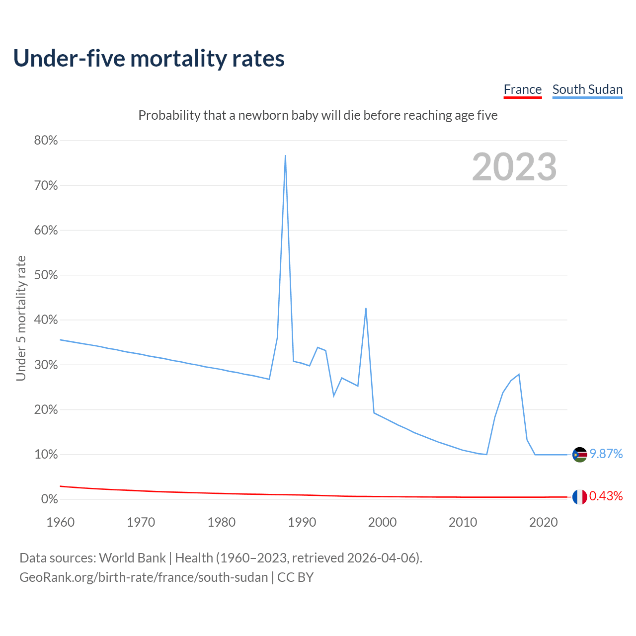 The chance that a newborn baby will die before reaching age five is 0.43% in France and 9.87% in South Sudan. Above is a chart with historical data on under-five mortality rates.