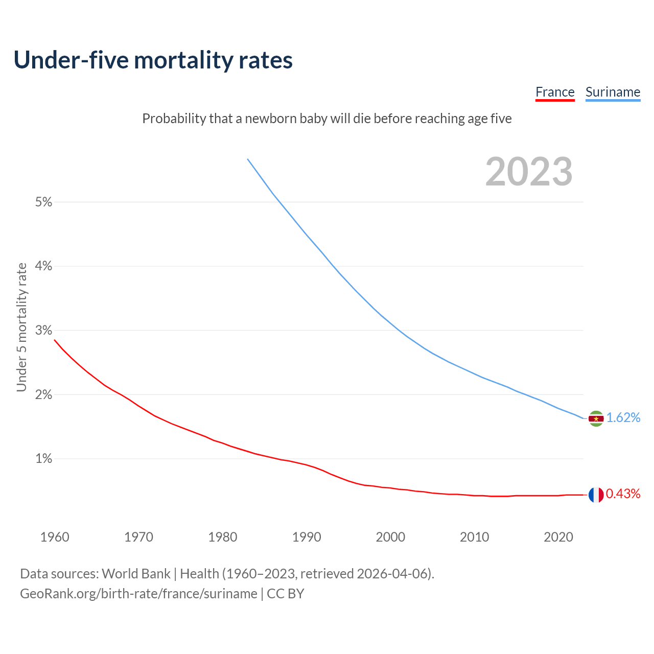 The chance that a newborn baby will die before reaching age five is 0.43% in France and 1.62% in Suriname. Above is a chart with historical data on under-five mortality rates.