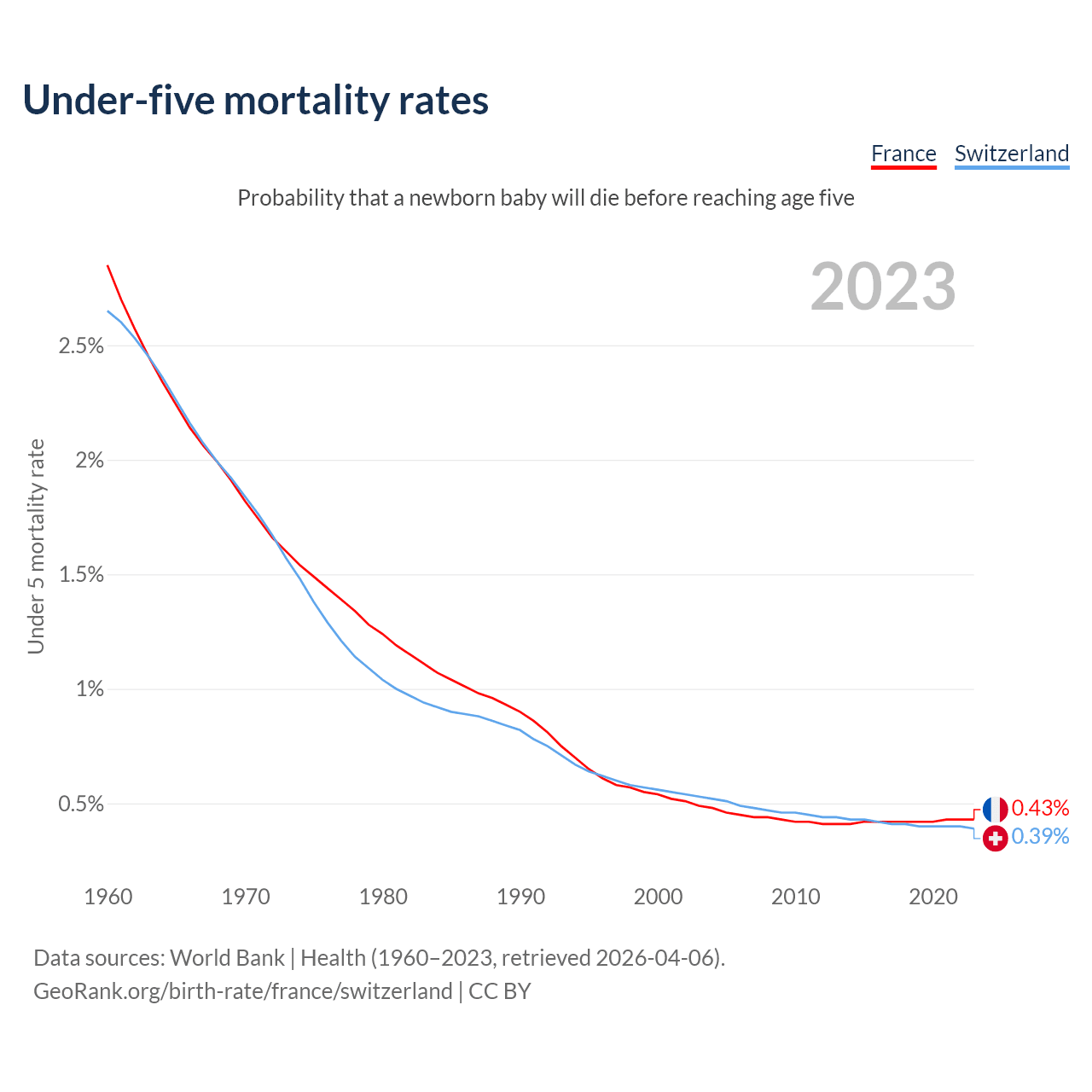 The chance that a newborn baby will die before reaching age five is 0.43% in France and 0.39% in Switzerland. Above is a chart with historical data on under-five mortality rates.