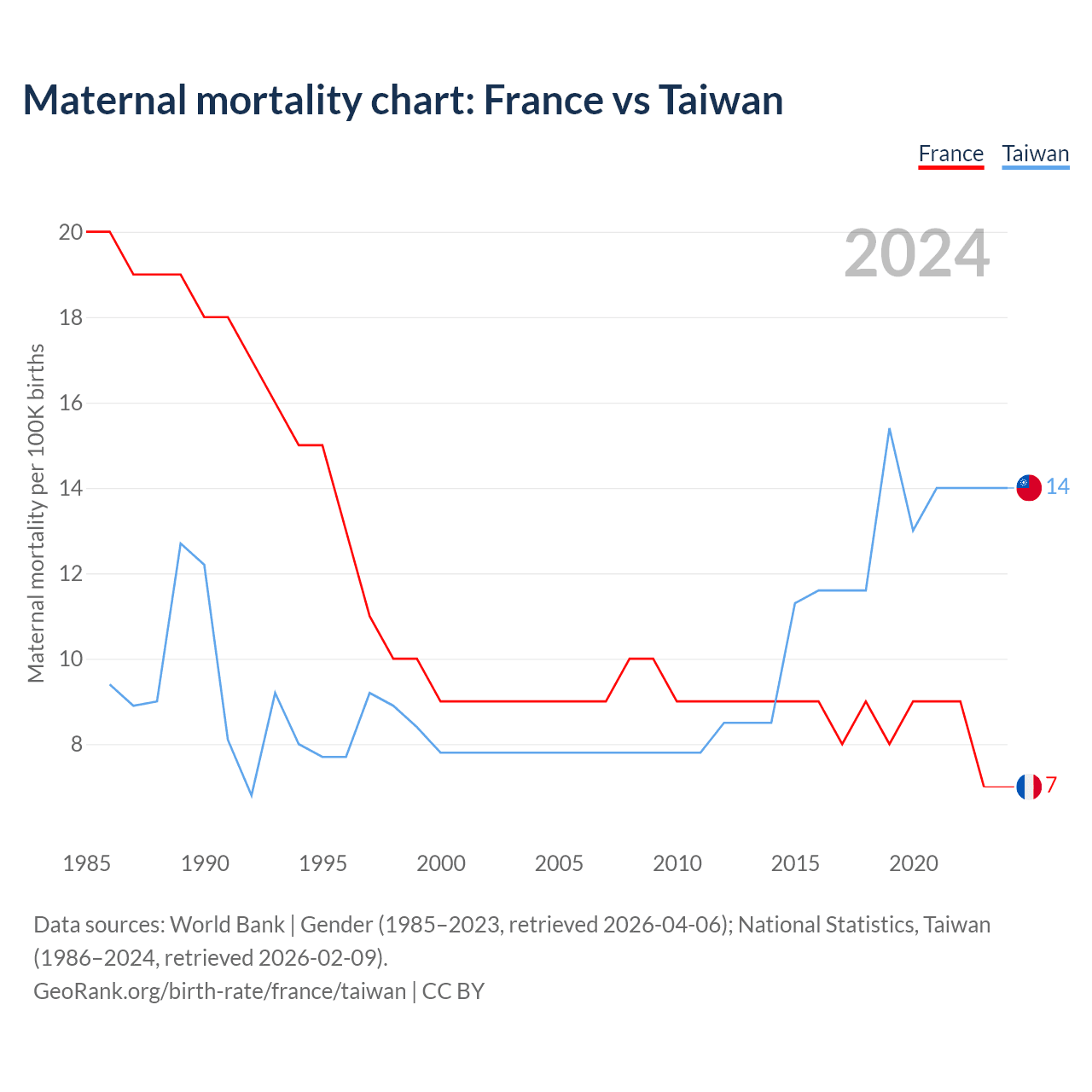 The maternal mortality rate, which is the probability of dying during childbirth or within 42 days of pregnancy termination, is 7 deaths per 100,000 live births in France, compared to 14 deaths in Taiwan.