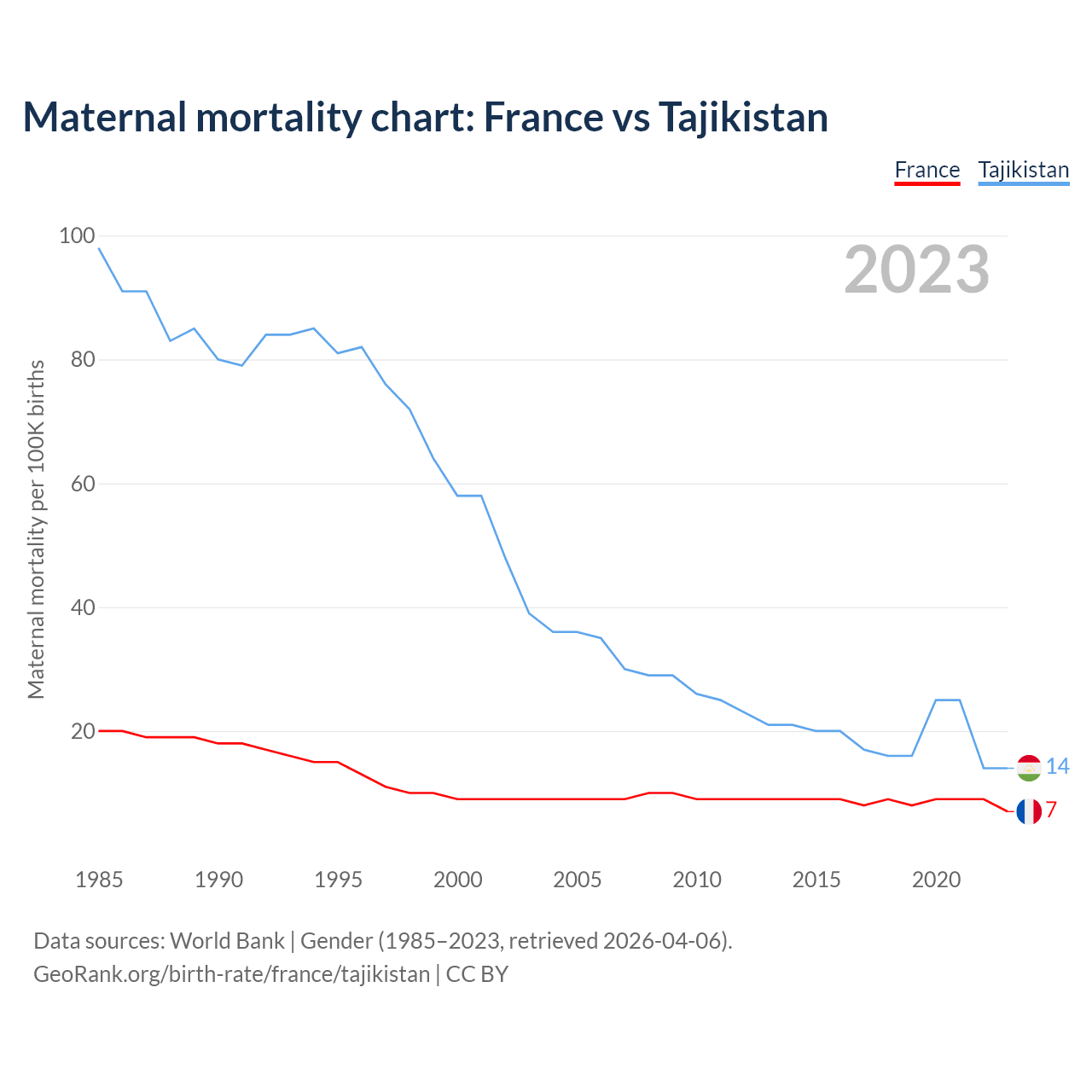 The maternal mortality rate, which is the probability of dying during childbirth or within 42 days of pregnancy termination, is 7 deaths per 100,000 live births in France, compared to 14 deaths in Tajikistan.