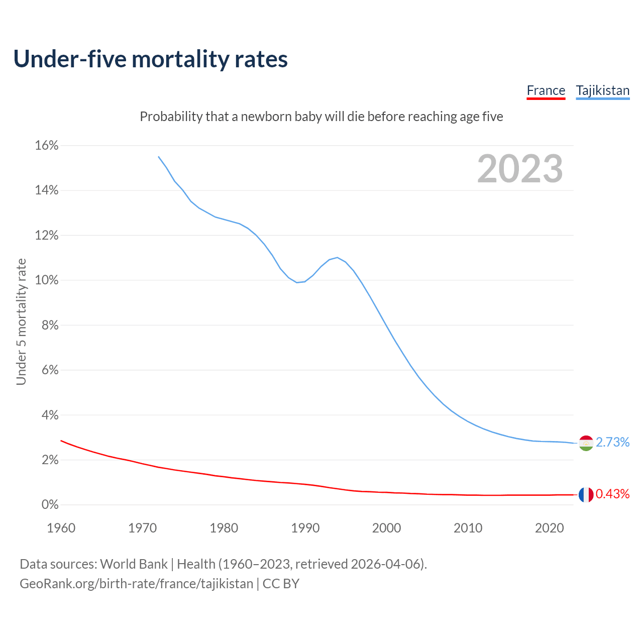 The chance that a newborn baby will die before reaching age five is 0.43% in France and 2.73% in Tajikistan. Above is a chart with historical data on under-five mortality rates.