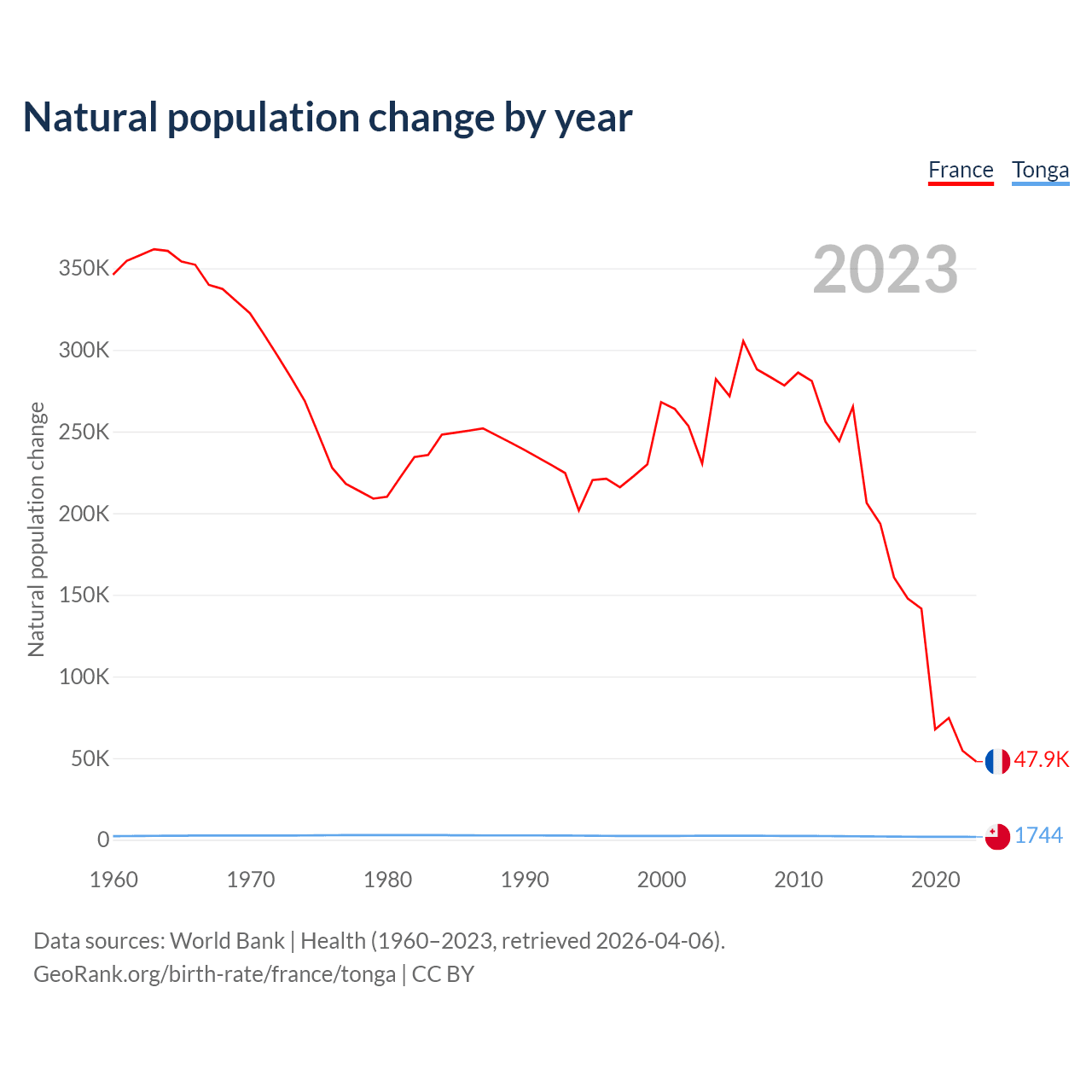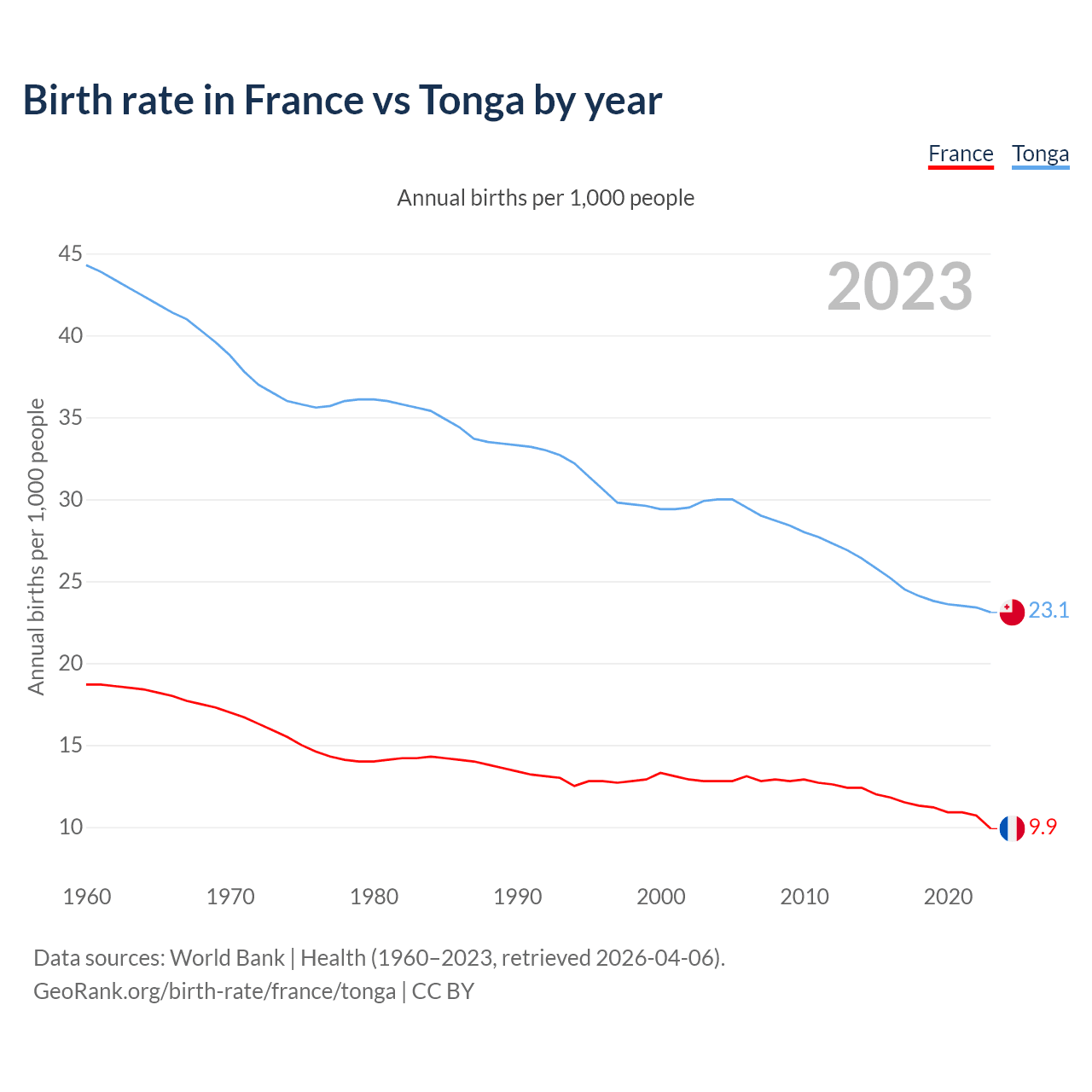 France has an annual birth rate of 9.9 births per 1,000 people, compared to 23.1 for Tonga. The average number of children a woman is expected to have during her lifetime — the fertility rate, is 1.66 in France and 3.13 in Tonga — 88.5% difference.