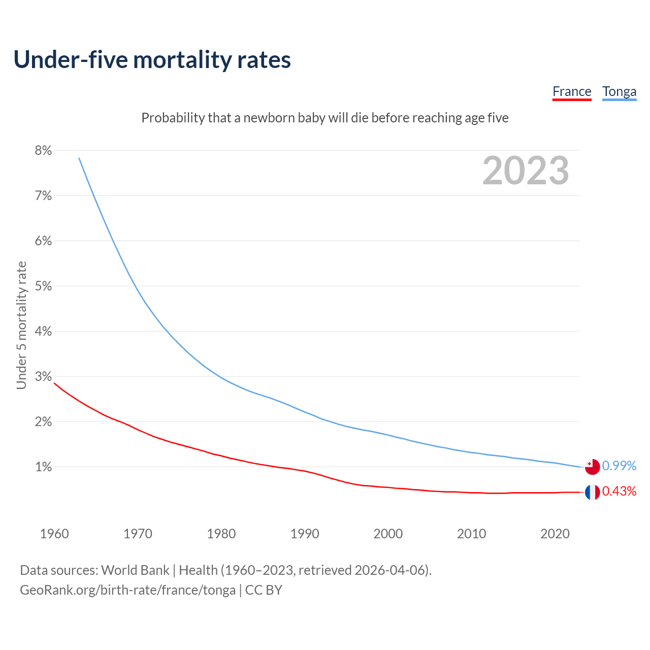The chance that a newborn baby will die before reaching age five is 0.43% in France and 0.99% in Tonga. Above is a chart with historical data on under-five mortality rates.