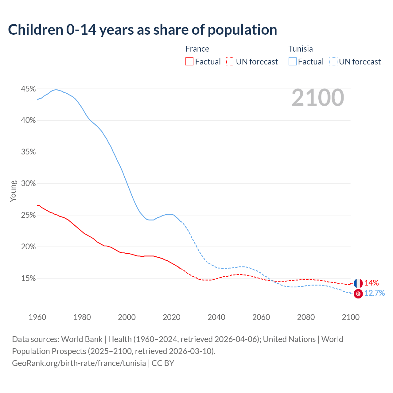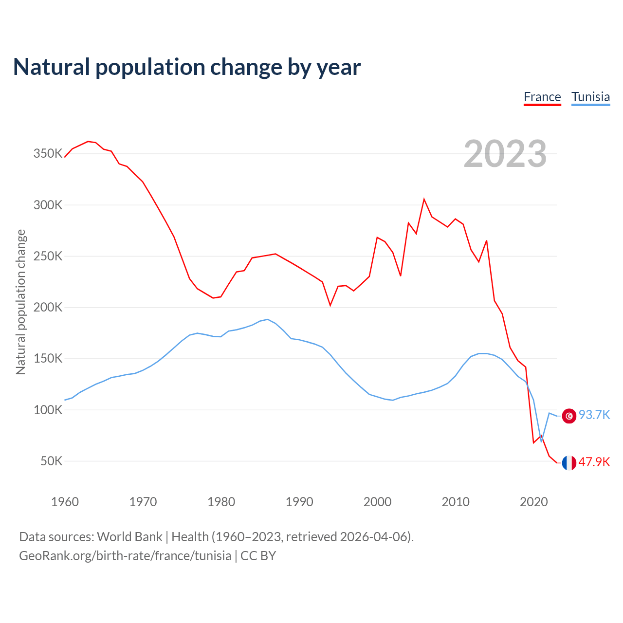 According to the latest available data on birth rates, the fertility rate in France was 1.66 children per woman in 2023, compared to 1.83 in Tunisia in 2023. The replacement level is considered to be 2.1 children per woman.