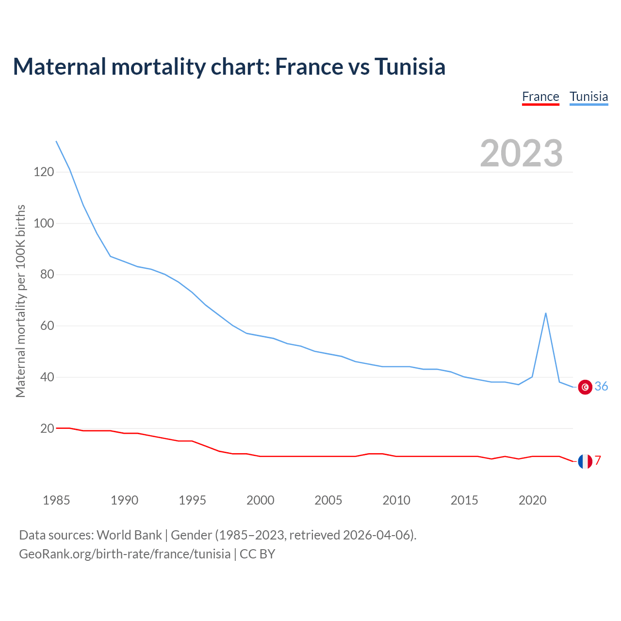 The maternal mortality rate, which is the probability of dying during childbirth or within 42 days of pregnancy termination, is 7 deaths per 100,000 live births in France, compared to 36 deaths in Tunisia.
