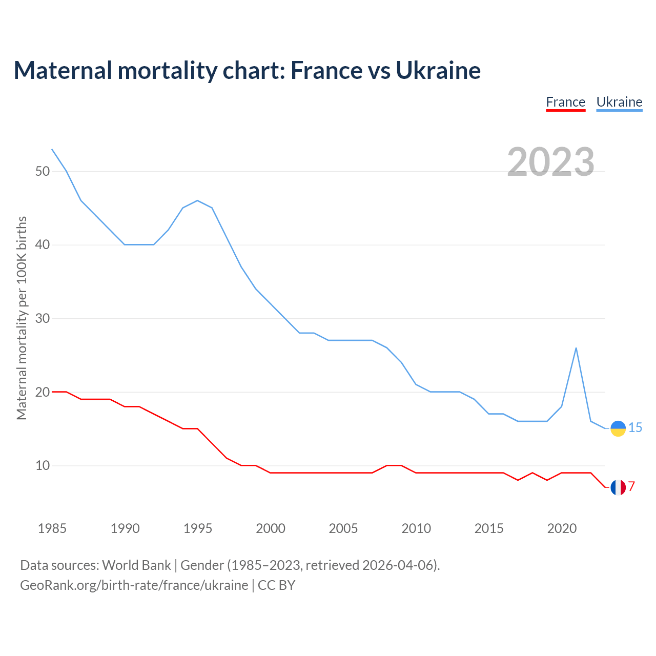 The maternal mortality rate, which is the probability of dying during childbirth or within 42 days of pregnancy termination, is 7 deaths per 100,000 live births in France, compared to 15 deaths in Ukraine.
