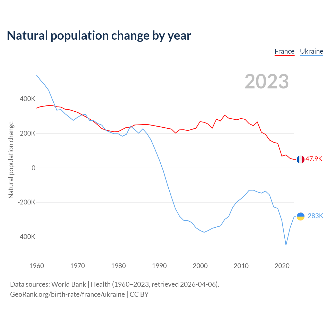 According to the latest available data on birth rates, the fertility rate in France was 1.66 children per woman in 2023, compared to 0.98 in Ukraine in 2023. The replacement level is considered to be 2.1 children per woman.