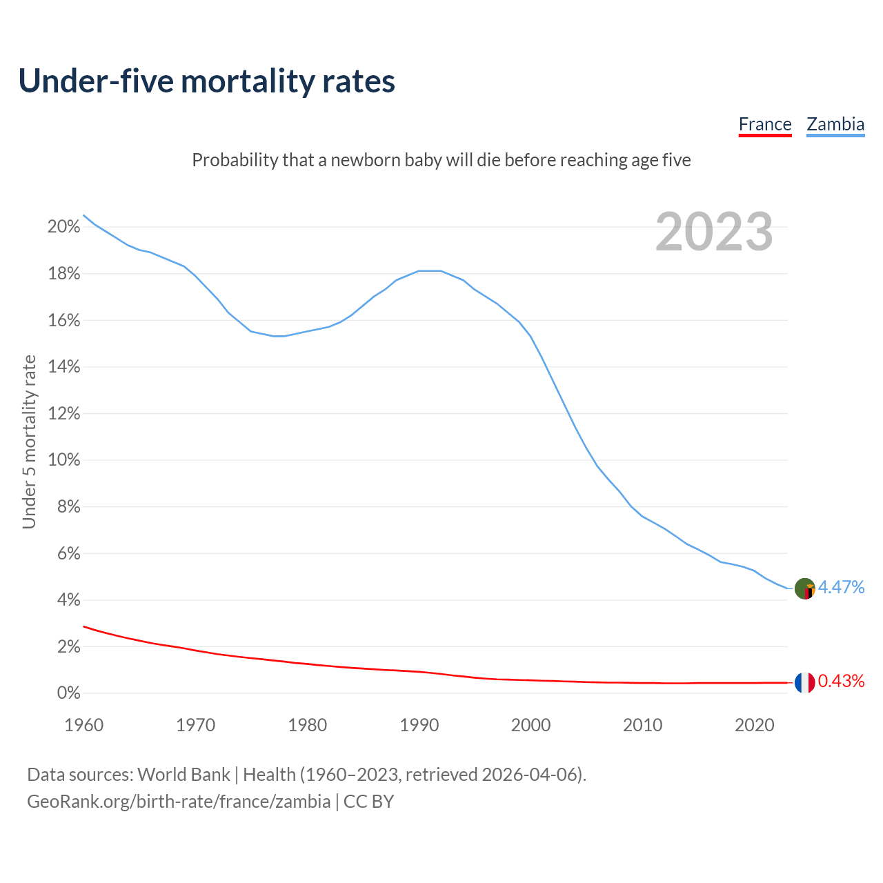 The chance that a newborn baby will die before reaching age five is 0.43% in France and 4.47% in Zambia. Above is a chart with historical data on under-five mortality rates.