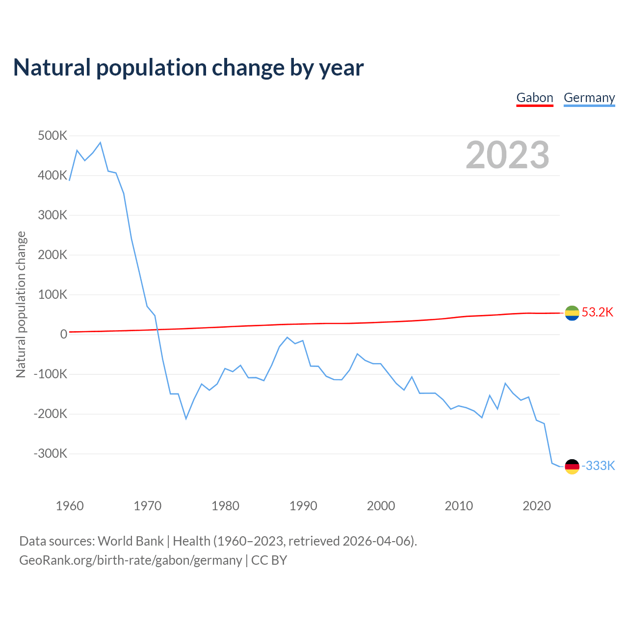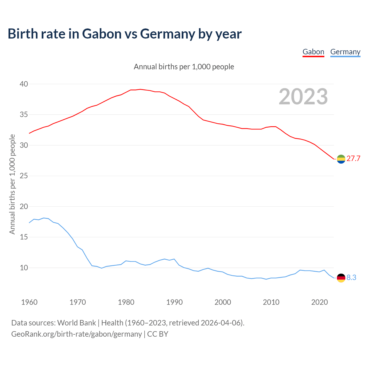 Gabon has an annual birth rate of 27.7 births per 1,000 people, compared to 8.3 for Germany. The average number of children a woman is expected to have during her lifetime — the fertility rate, is 3.65 in Gabon and 1.39 in Germany — 61.9% difference.
