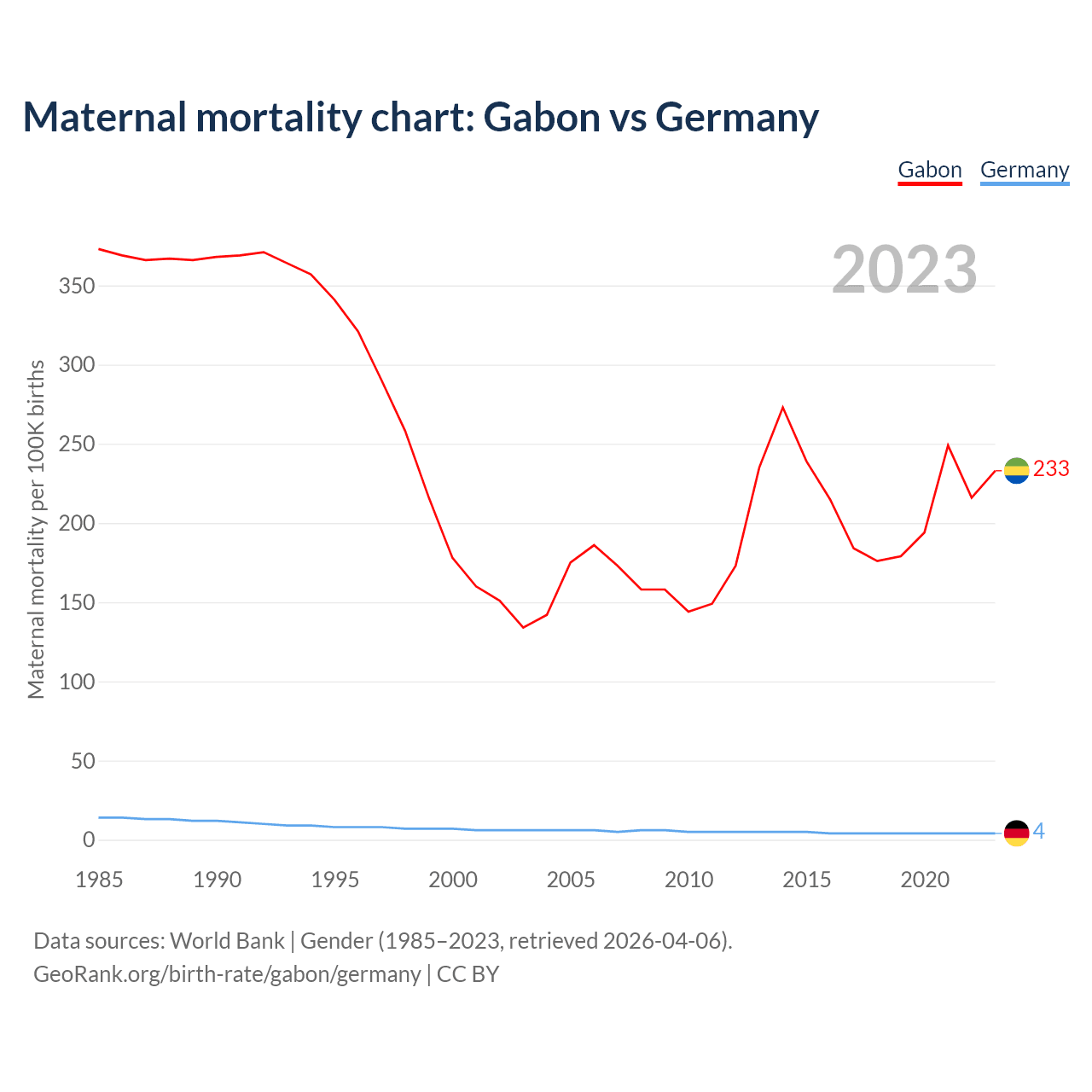 The maternal mortality rate, which is the probability of dying during childbirth or within 42 days of pregnancy termination, is 233 deaths per 100,000 live births in Gabon, compared to 4 deaths in Germany.