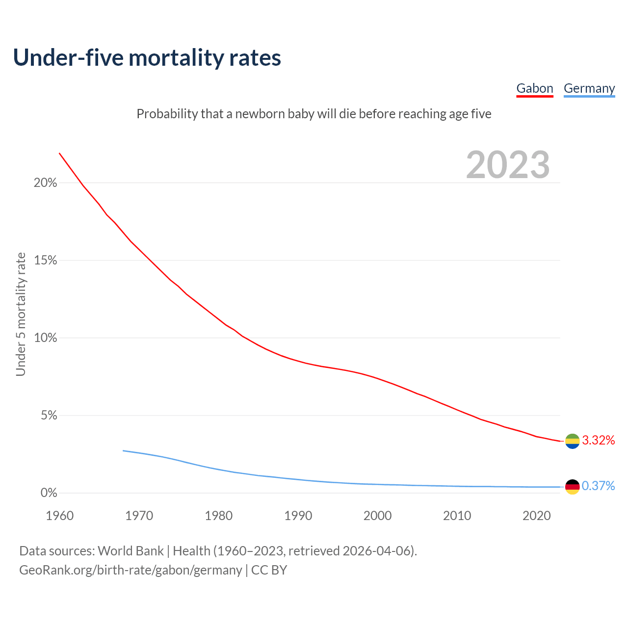 The chance that a newborn baby will die before reaching age five is 3.32% in Gabon and 0.37% in Germany. Above is a chart with historical data on under-five mortality rates.